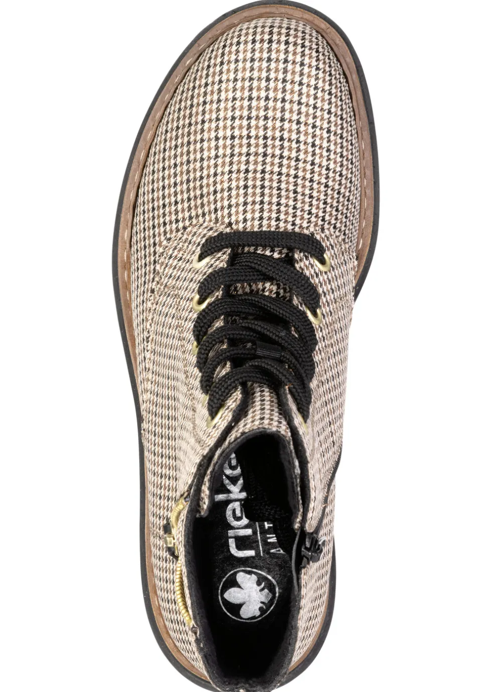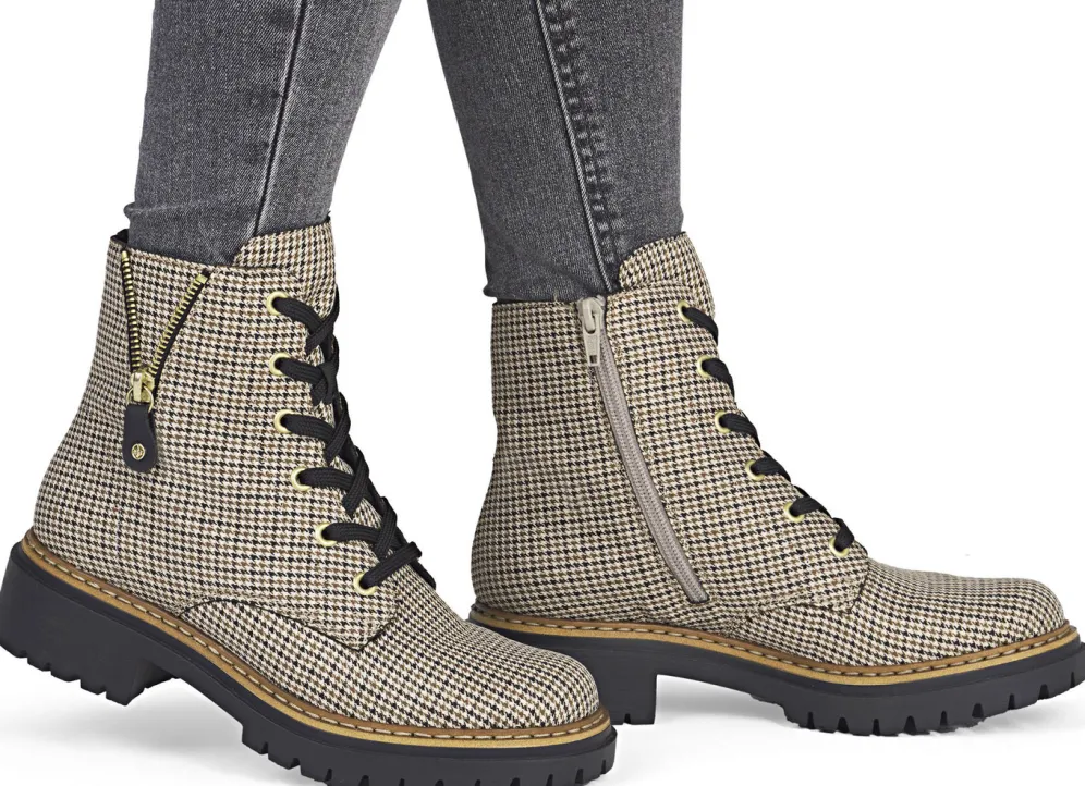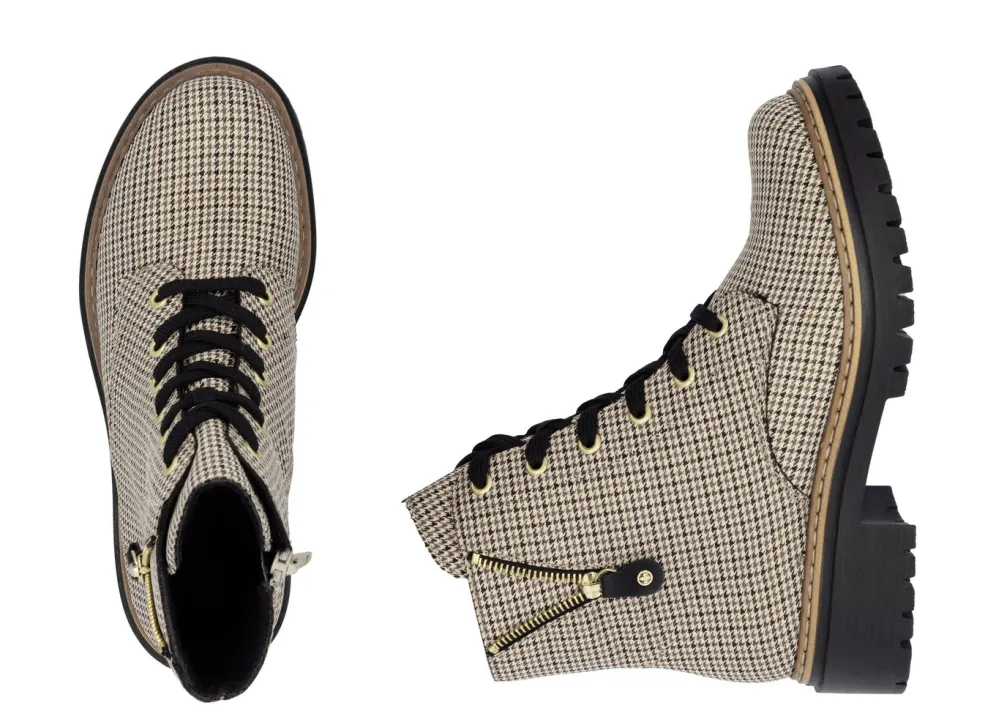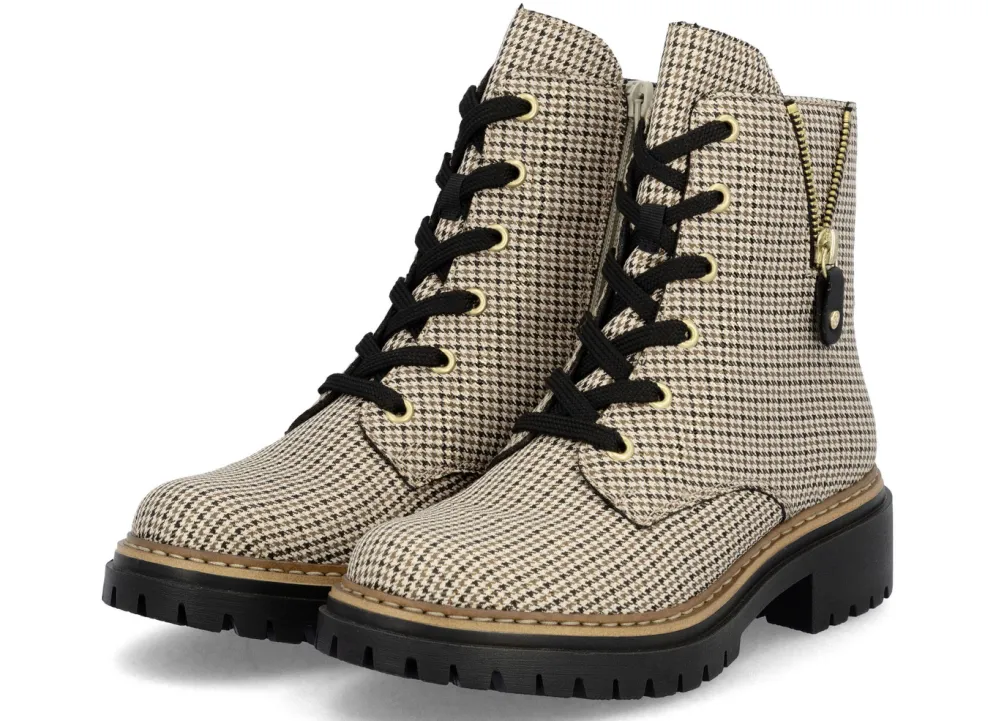 Rieker, trendige Damen-Stiefeletten, Winterschuhe, mit Reißverschluss in Beige-Schwarz und in Größe 42.