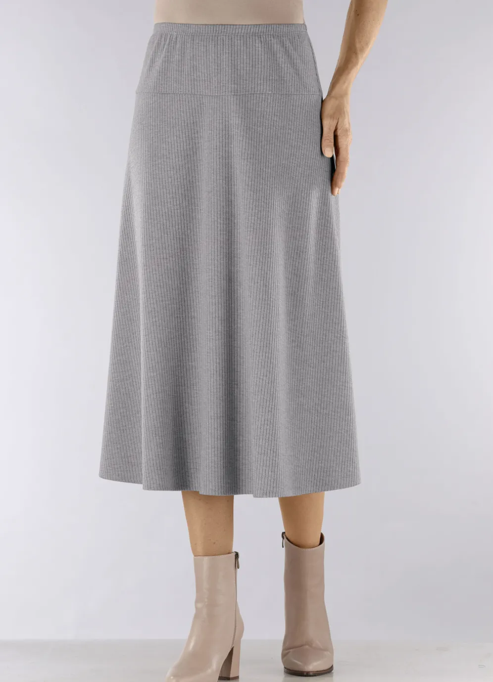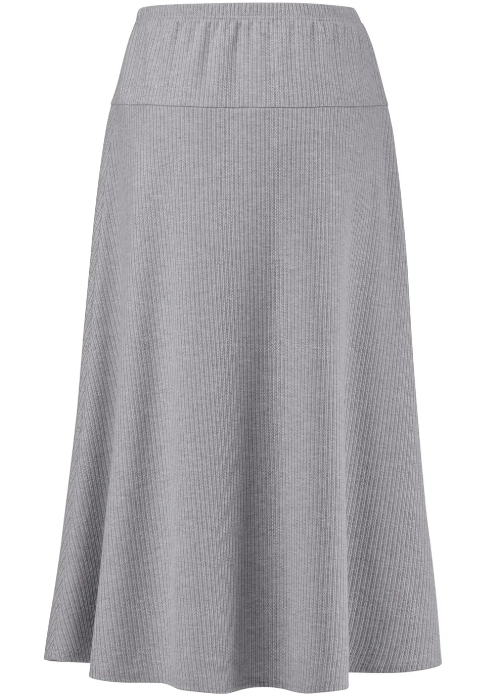 Attraktiver Rock von Stilschmiede in bequemer Schlupfform mit schmalem Dehnbund sowie figurgünstiger, breiter Passe rundum. Die leichte Tellerform verleiht diesem Modell seine duftige Weite. Gesamtlänge ca. 78 cm, bei K-Gr. ca. 72 cm. Die Qualität: bi-elastischer Jersey in Rippen-Optik aus 85% Polyester und 15% Viskose