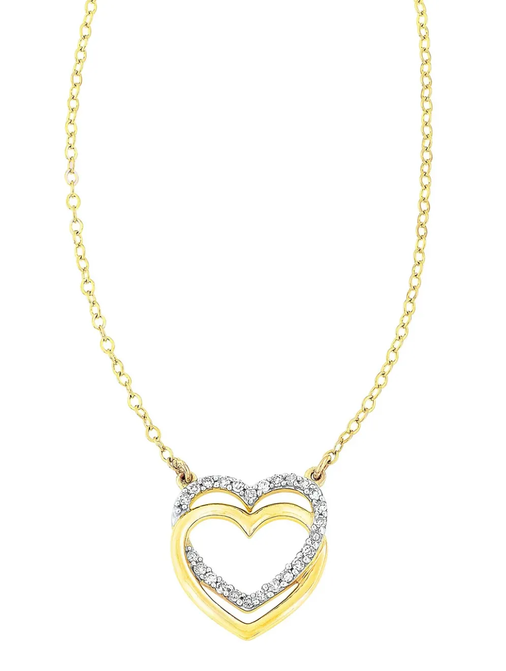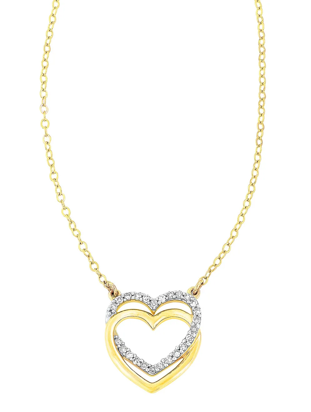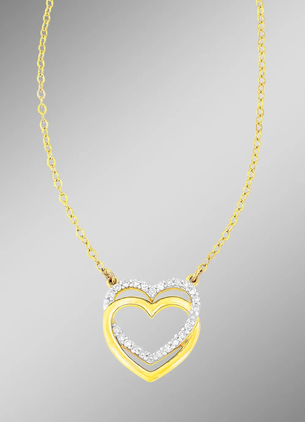 Zwei Herzen schlagen im gleichen Takt. Dafür steht diese romantische Halskette aus Gold 585/- fein. Eines der Herzen glänzt in edlem Gelbgold, das andere funkelt mit 25 Diamanten, zusammen ca. 0,13 ct., Weiß, Piqué 2. Die miteinander verschlungenen Herzen sind jeweils 12×13 mm groß.