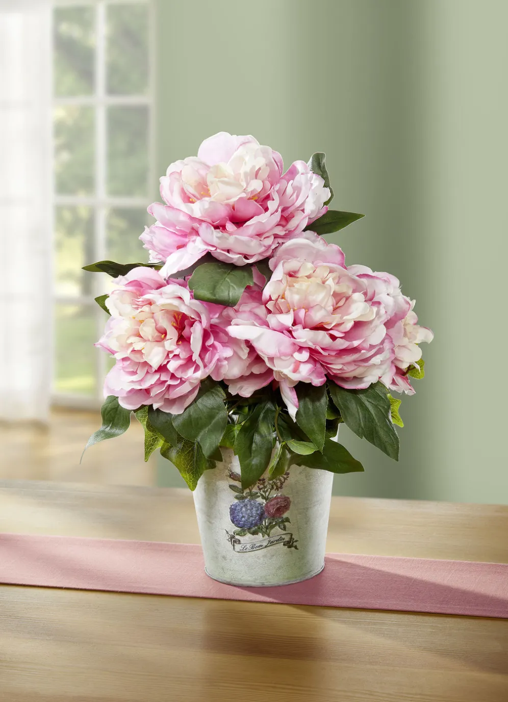 Prachtvolle Rosenblüten wurden gemeinsam mit grünem Beiwerk in einen Topf aus Metall eingesetzt und sorgen so für romantische Stimmung in Ihrem Zuhause. Der Topf ist mit einem Blumen-Motiv gestaltet. Aus hochwertigem Kunst- und Textilmaterial gefertigt. Maße: Gesamthöhe ca. 35 cm, Topf: Höhe 13,5 cm, Ø 13,5 cm.