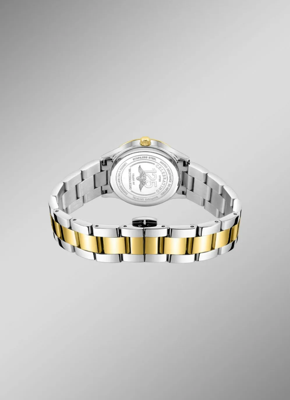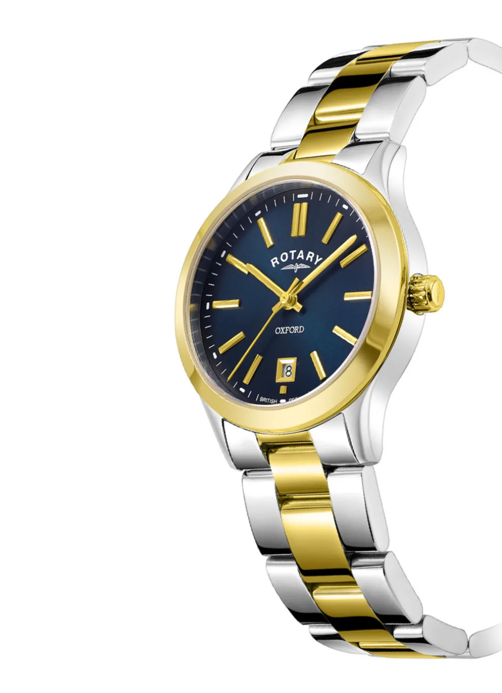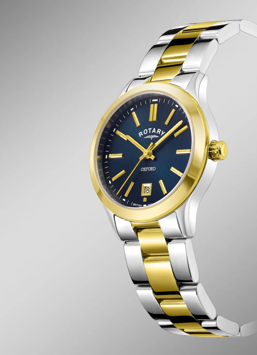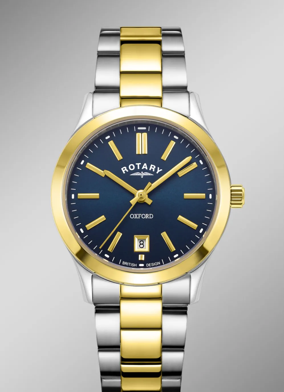Mit ihrem 30-mm-Gehäuse aus zweifarbig goldfarbenem PVD-Edelstahl, dem blauen Sonnenschliff-Zifferblatt mit goldenen Akzenten und dem zweifarbig goldfarbenen PVD-Edelstahlarmband ist diese Rotary Contemporary zeitlos schön. 50 m Wasserdichtigkeit und ein Datum bei 6 Uhr machen dieses Premium-Design praktisch.