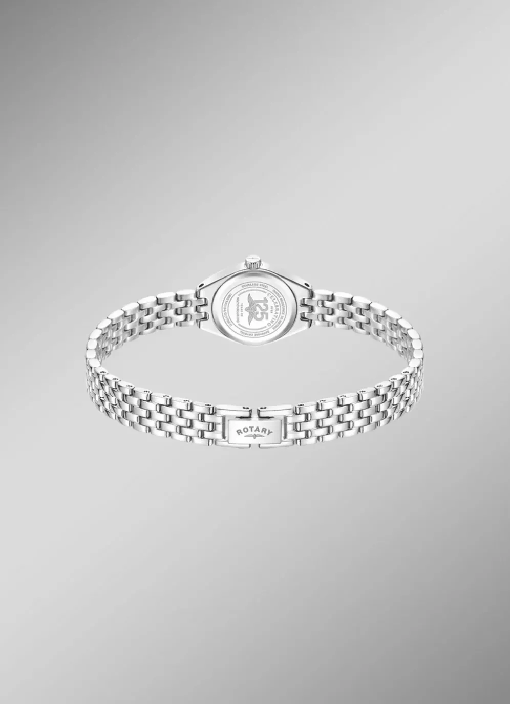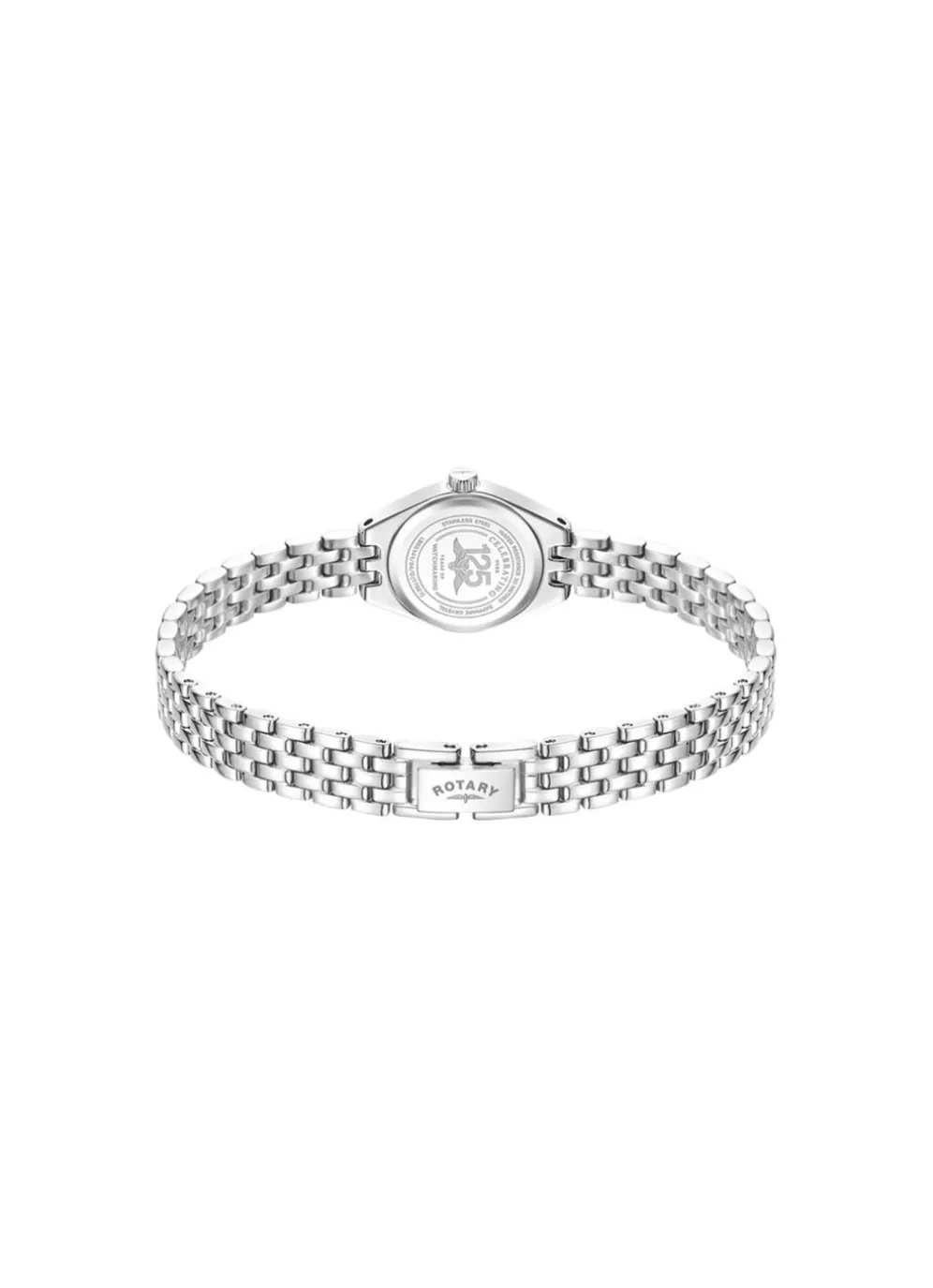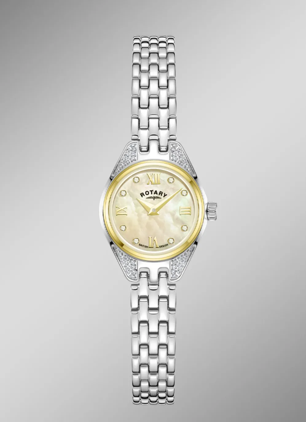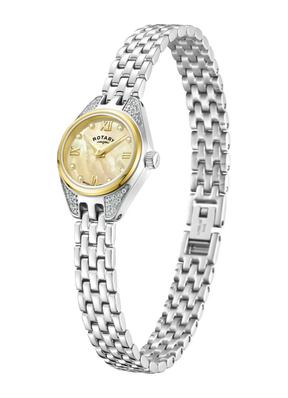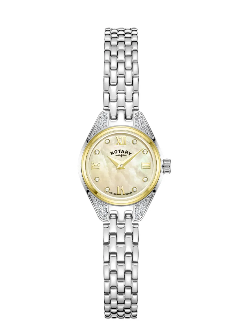 Wir präsentieren die Rotary Traditional, eine zarte Cocktailuhr für Damen, die Eleganz und Raffinesse verkörpert. Das zierliche 20-mm-Gehäuse umschließt ein faszinierendes Perlmutt-Zifferblatt, das einen subtilen Schimmer ausstrahlt, der seine Anziehungskraft noch verstärkt. Die mit Diamanten verzierten Indizes lassen diese Uhr funkeln und fangen das Licht wunderschön ein.