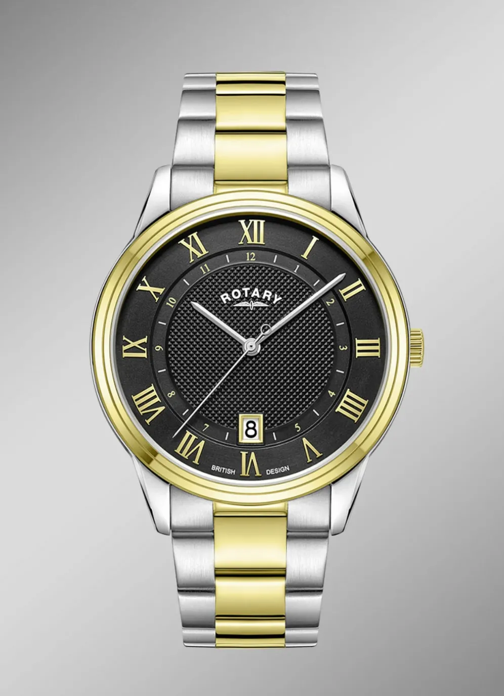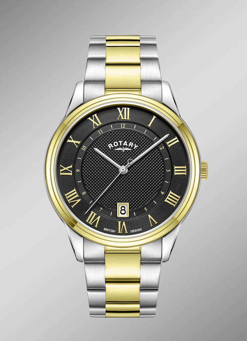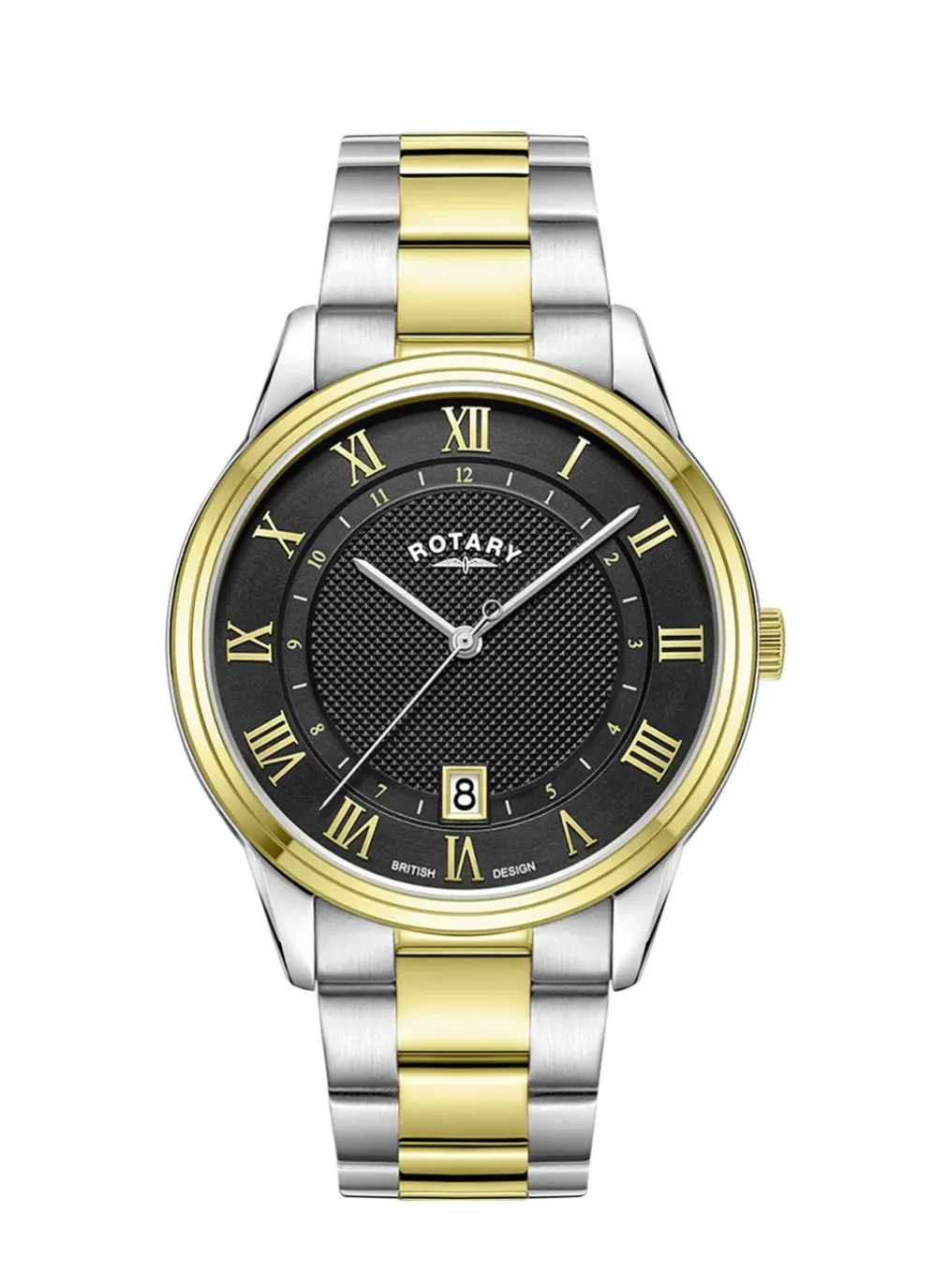 Die Essenz der Designphilosophie von Rotary Dress verkörpert das gestufte Zifferblatt mit Diamantstruktur, das klassischen Charme mit einem modernen Touch verbindet. Das 40-mm-Gehäuse aus zweifarbigem Edelstahl mit einer versteckten Krone strahlt Klasse aus. Das stufenförmige Zifferblatt mit Diamantstruktur ist mit applizierten römischen Ziffern aus Roségold verziert, die einen Hauch von Opulenz verleihen, sowie mit einer Innenspur mit arabischen Ziffern für ein klassisches Design.