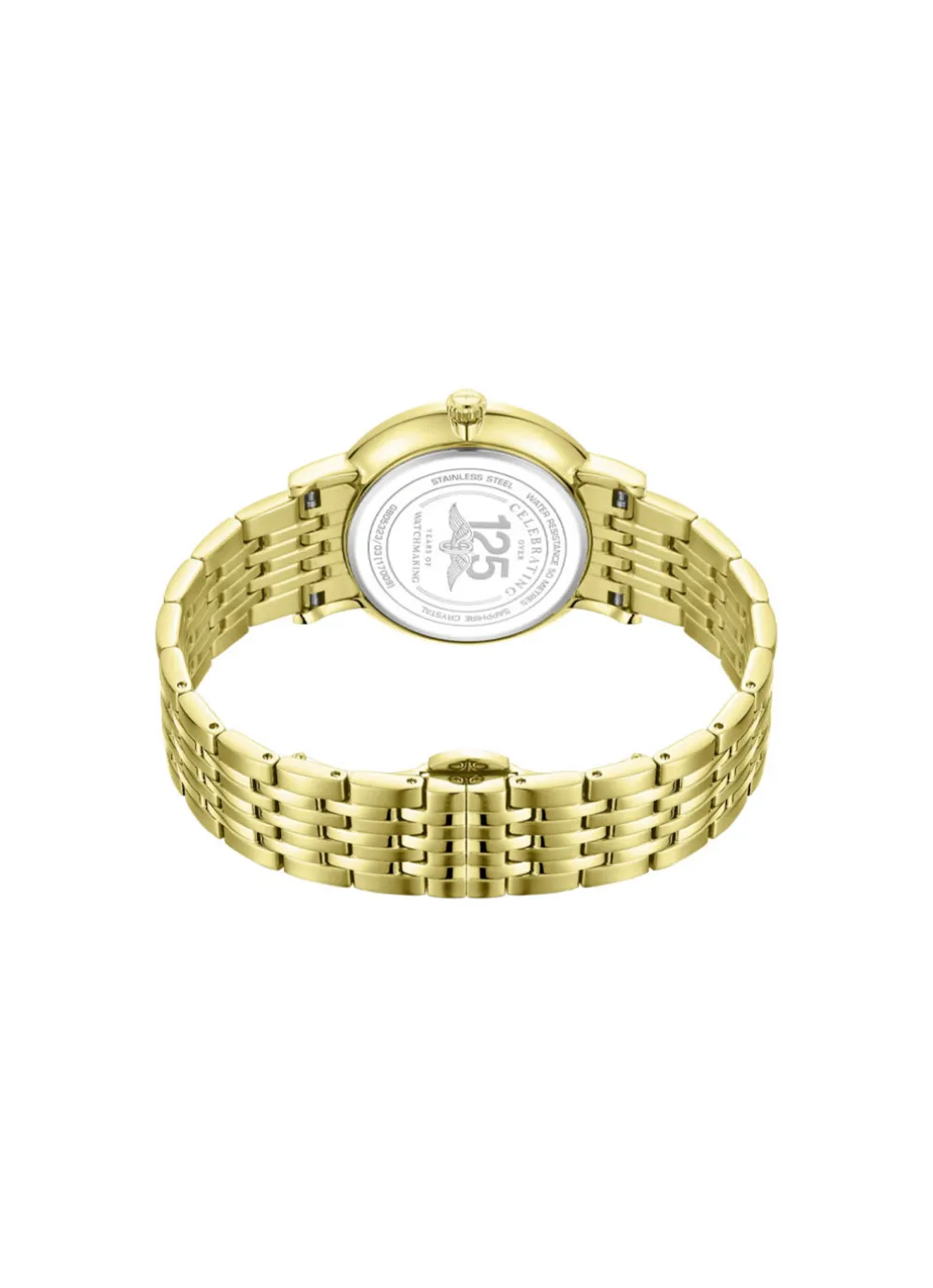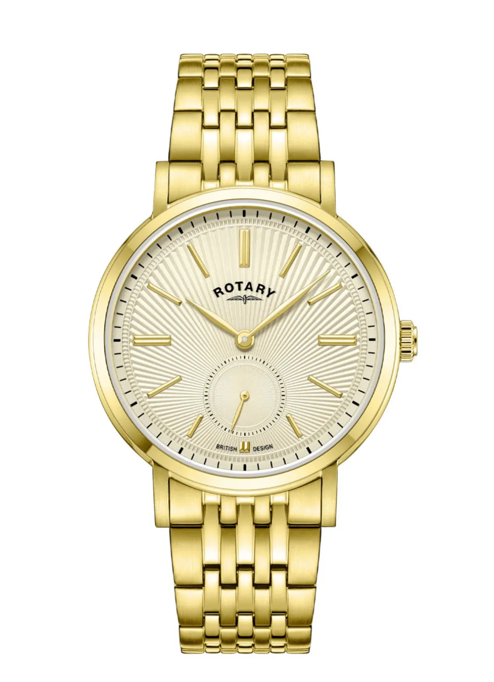 Mit seinem 37-mm-Edelstahlgehäuse und dem goldfarbenen Edelstahlarmband strahlt dieser Rotary Dress Zeitmesser Raffinesse aus. Das robuste Saphirglas schützt ein weißes guillochiertes Zifferblatt mit goldfarbenen Strichindizes und verleiht ihm einen Hauch von zeitloser Eleganz. Die gebürstete und polierte Oberfläche des Gehäuses unterstreicht den edlen Look.