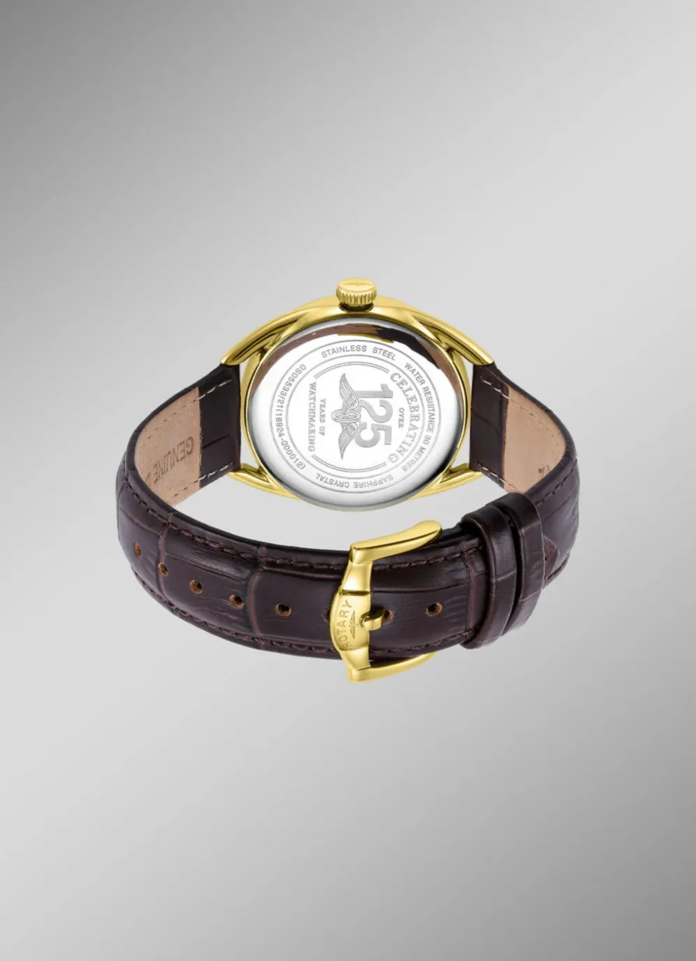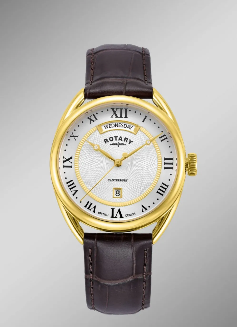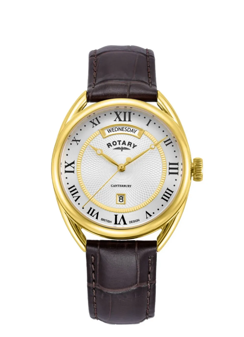 Erleben Sie zeitlose Raffinesse mit der Rotary Traditional. Dieser raffinierte Zeitmesser verfügt über ein 38-mm-Gehäuse aus goldfarbenem PVD-Edelstahl, eine traditionelle Wochentagskomplikation und ein fesselndes Zifferblatt mit hellem Guilloche-Spiralmuster. Römische Ziffern und klassische Breguet-Zeiger erinnern an die Eleganz des frühen 20. Jahrhunderts. Mit einem Armband aus echtem Leder ist diese Rotary Traditional das ultimative Accessoire für formale Raffinesse.
