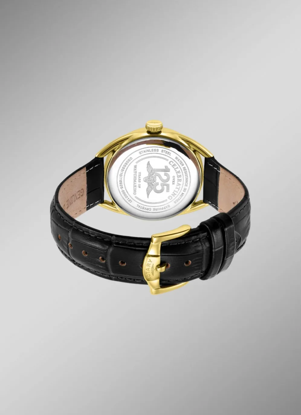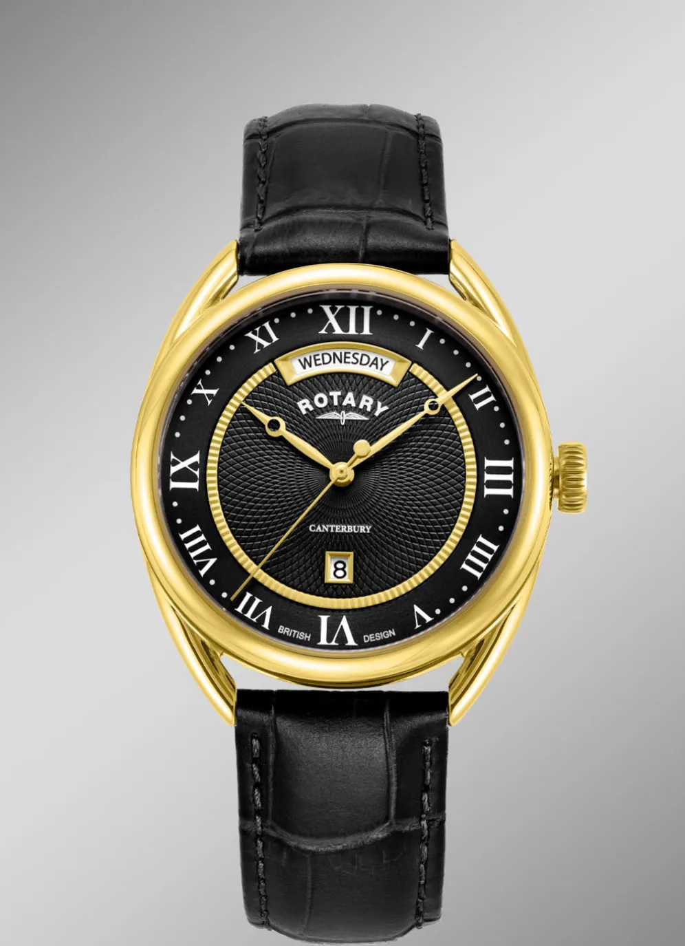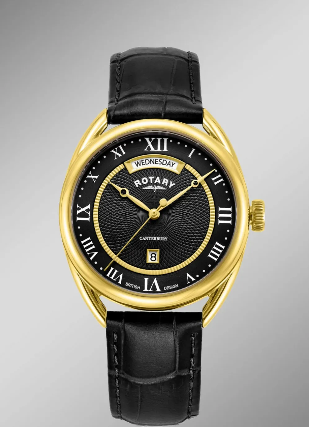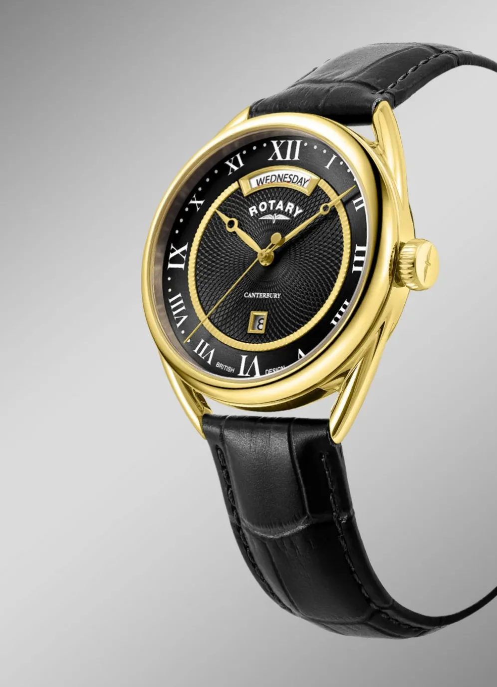 Erleben Sie zeitlose Raffinesse mit der Rotary Traditional. Dieser raffinierte Zeitmesser verfügt über ein 38-mm-Gehäuse aus goldfarbenem PVD-Edelstahl, eine traditionelle Wochentagskomplikation und ein fesselndes Zifferblatt mit dunklem Guilloche-Spiralmuster. Römische Ziffern und klassische Breguet-Zeiger erinnern an die Eleganz des frühen 20. Jahrhunderts. Mit einem Armband aus echtem Leder ist diese Rotary Traditional das ultimative Accessoire für formale Raffinesse.
