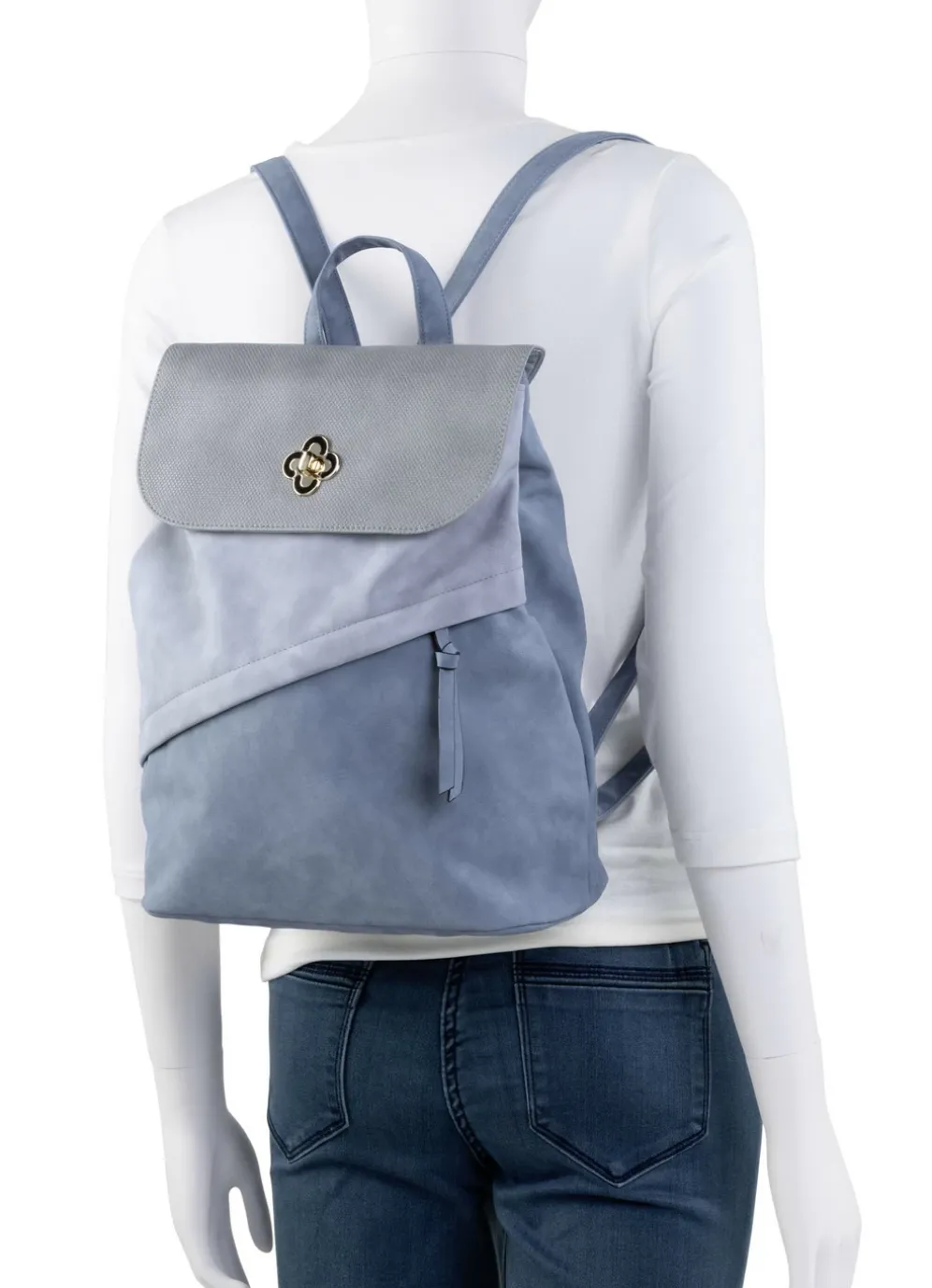 Rucksack mit Überschlag und Drehschloss in Jeans-Grau.