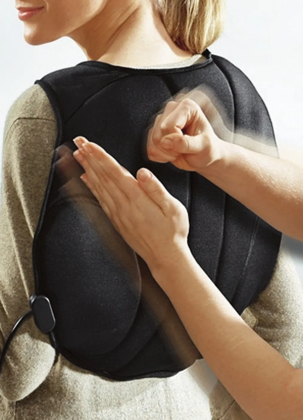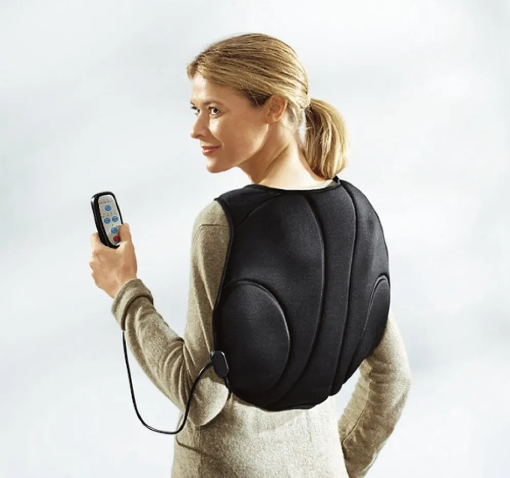 Gönnen Sie sich eine wohltuende Massage. Einseitige Belastungen führen gerade im Nacken- und Rückenbereich oft zu schmerzhaften Verspannungen. Dieses Gerät massiert und wärmt ohne fremde Hilfe. 4 klassische Massagefunktionen (Pressen, Welle, Normal und Klopfen), die jeweils in Position und Intensität variierbar sind. Zuschaltbare Wärme sorgt für zusätzliches Wohlbefinden. Das Gerät ist leicht (560 g ohne Netzteil) und mit angenehm weichem Stoff bezogen. Die Gurte werden größenunabhängig und bequem mit Klettverschluss befestigt.