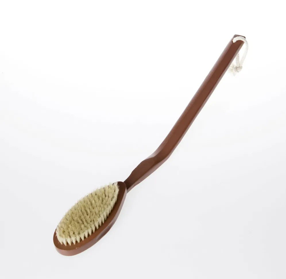 Die Rückenbürste aus Holz mit Naturborsten verlängert Ihren Arm, so kommen Sie an alle Körperstellen. Mit extra langem, körpergerecht geformten Stiel. Die Naturborsten seifen ein, massieren und bürsten gründlich und wohlig. Ideal für die Reinigung von Rücken. Einfache Handhabung. Maße: ca. Länge 50 cm