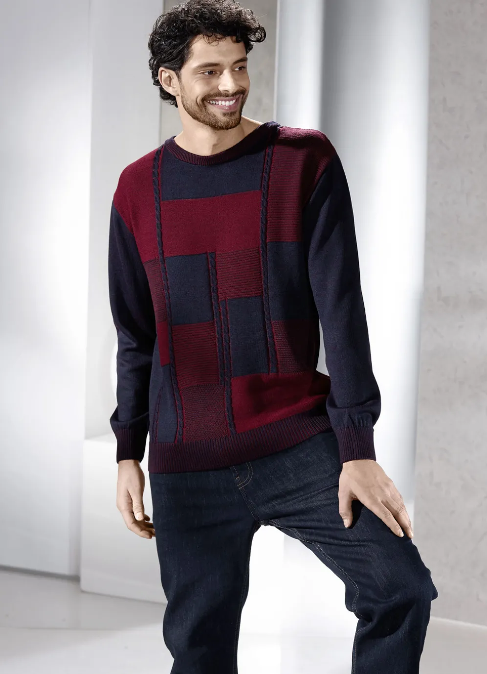 Toll zu kombinieren ist dieser Rundhalspullover mit Strukturdessin am gemusterten Vorderteil, langen Ärmeln sowie Rippenstrick-Abschlüssen.