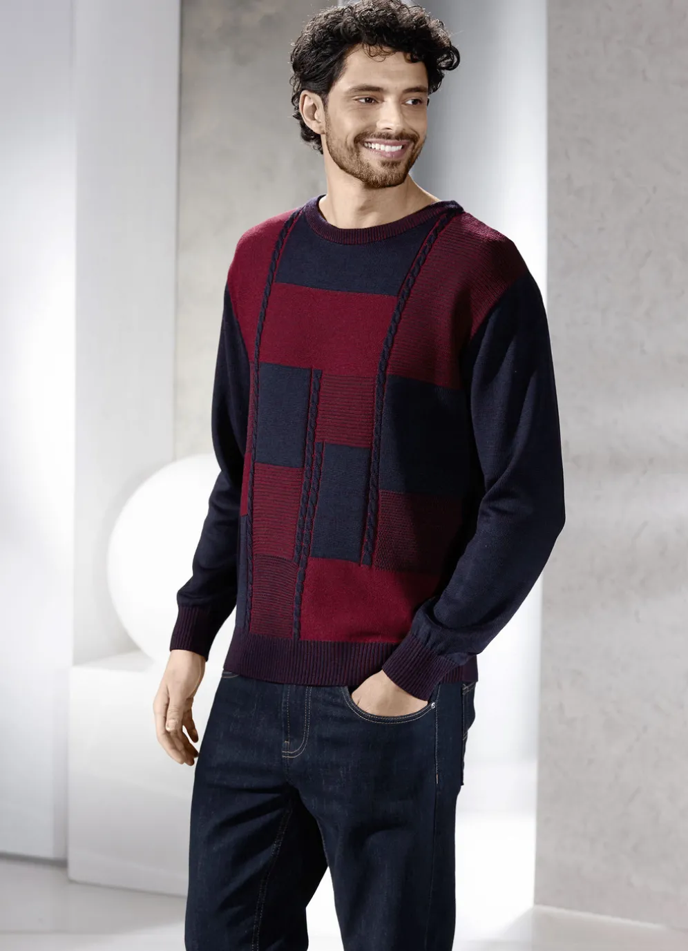 Rundhalspullover in 2 Farben in Bordeaux-Marine Meliert und in Größe 46.