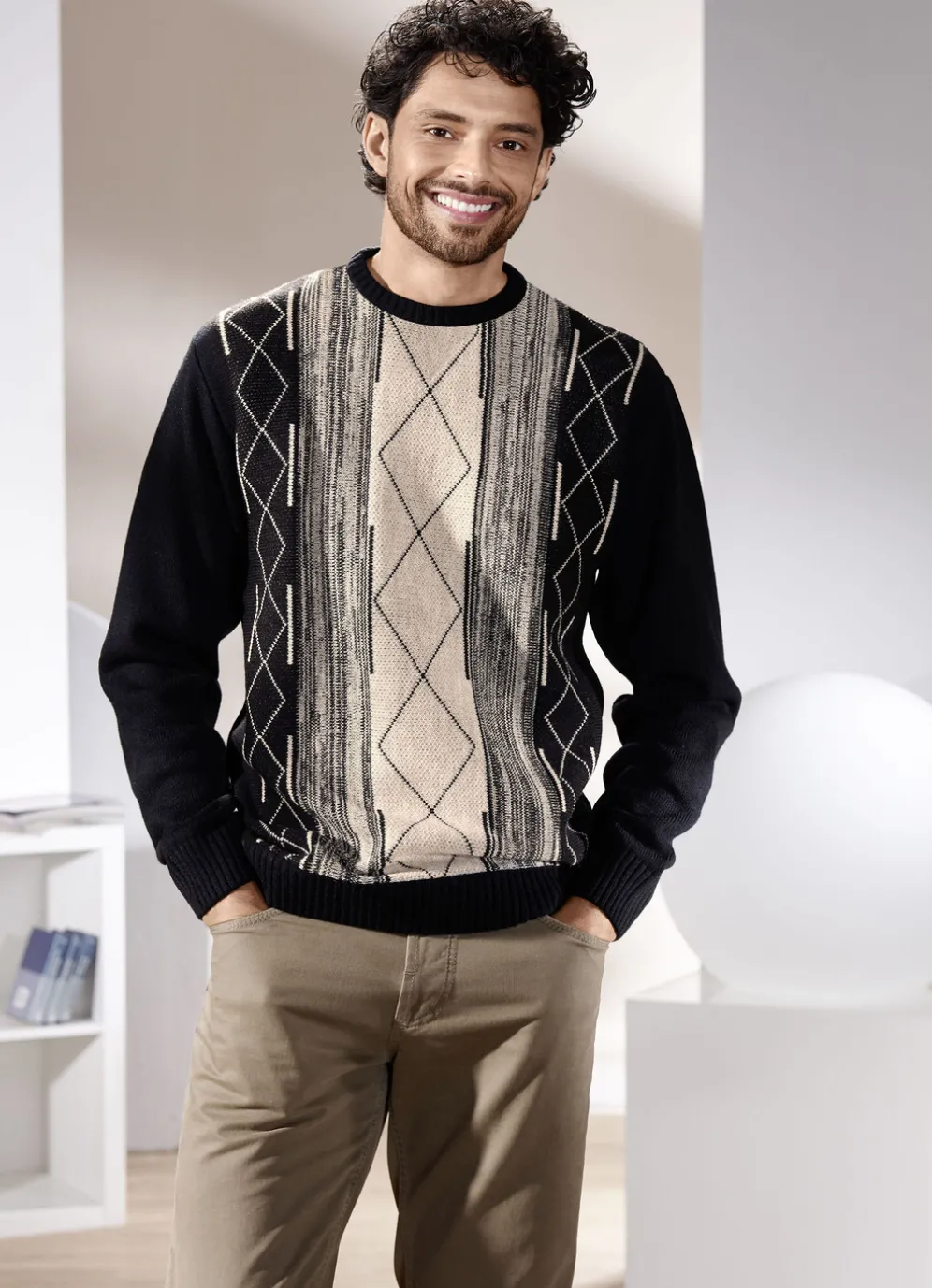 Rundhalspullover mit Jacquarddessin in Schwarz-Beige und in Größe 46.