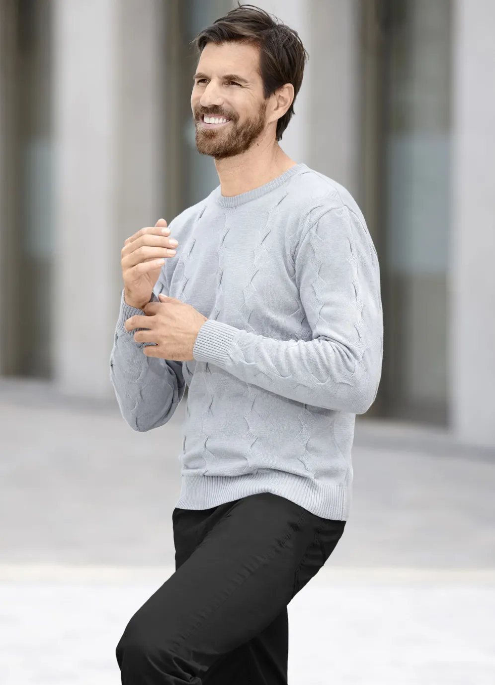 Rundhalspullover mit Strukturdessin in 3 Farben in Blau und in Größe 56.