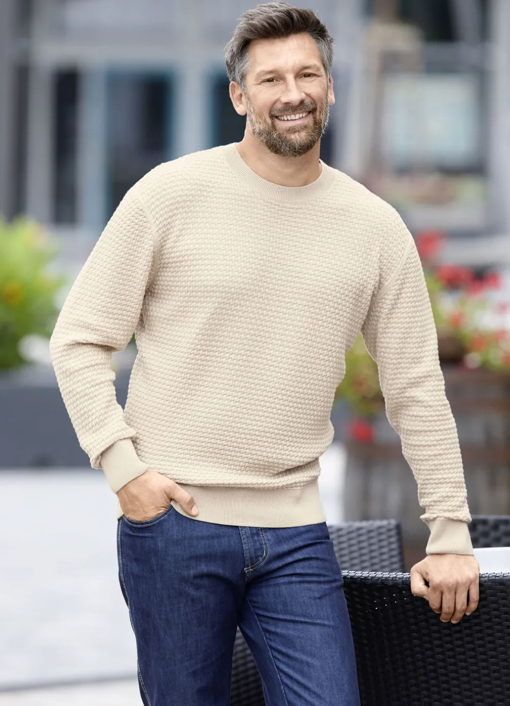 Rundhalspullover mit Strukturdessin in 3 Farben in Beige und in Größe 52.