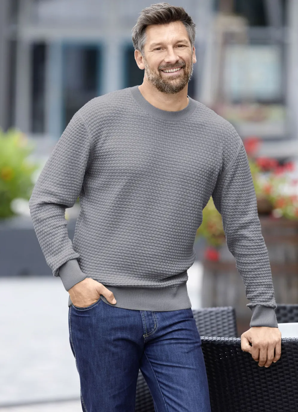 Ein Modell der Extraklasse ist dieser unifarbene Rundhalspullover mit Strukturdessin allover und Rippenstrick- Abschlüssen.