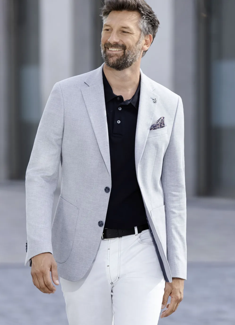 Einreihiger Sakko in Hellblau, mit 2-Knopf- Verschluss, Brustleistentasche mit Einstecktuch, aufgesetzten Taschen, Seitenschlitze sowie zwei Innentaschen.