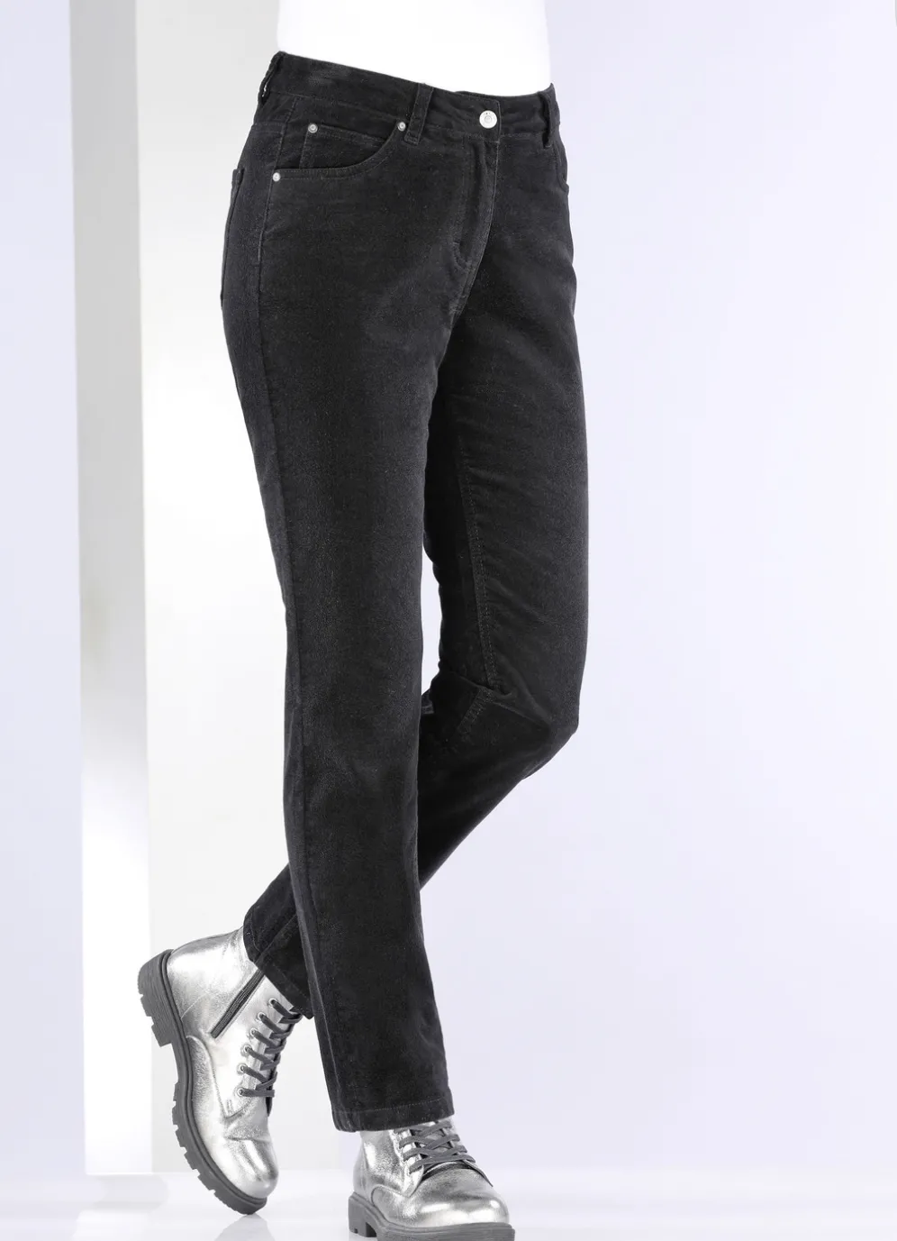 Samtweiche Velvet-Hose in 5-Pocket-Form: elastischer Formbund, Gürtelschlaufen, Knopf- und Reißverschluss sowie figurformende Passe im Rückteil. Innenbeinlänge ca. 77 cm, Fußweite ab 32 cm.