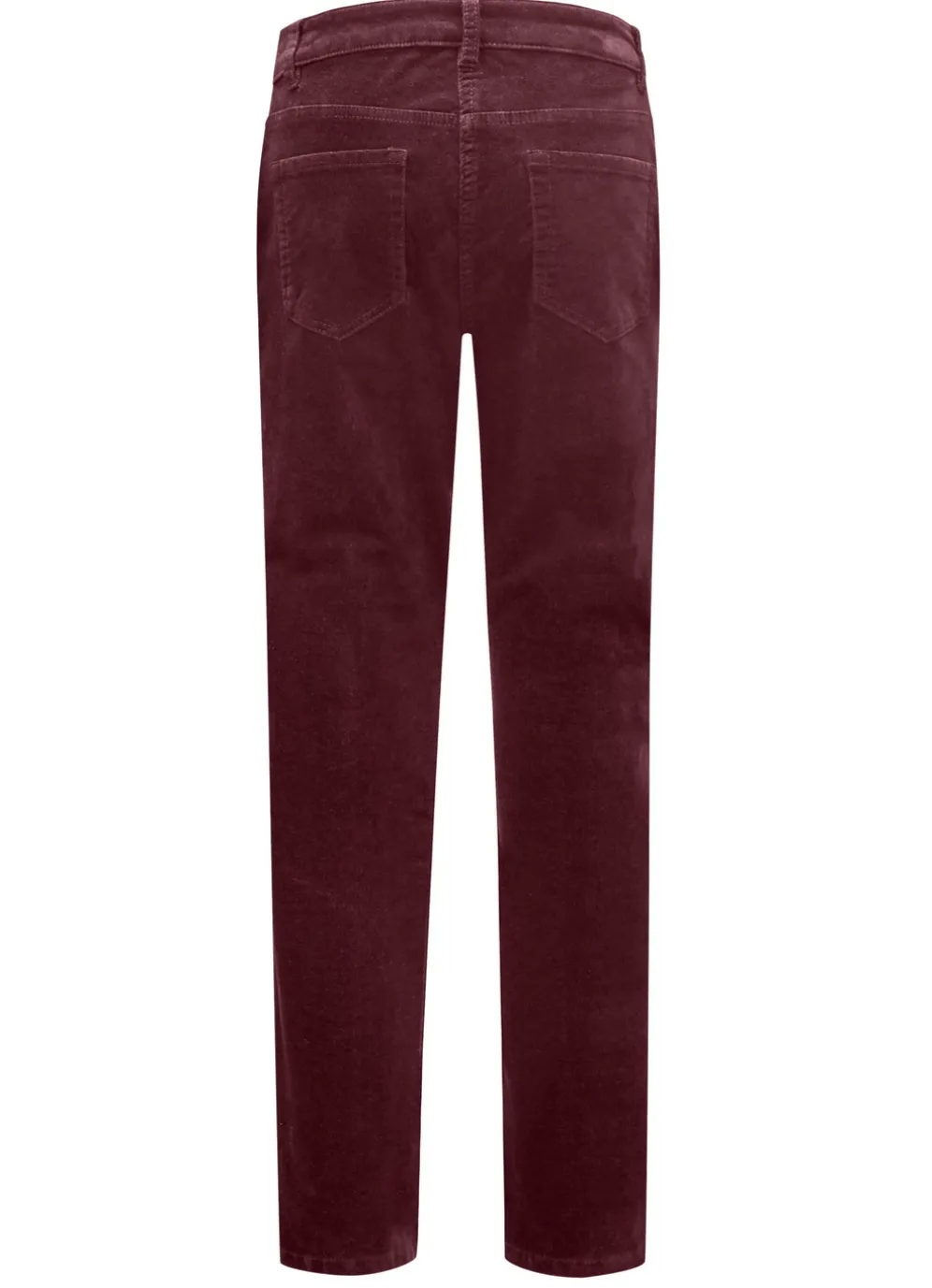 Samtweiche Hose in 5-Pocket-Form in Bordeaux und in Größe 34.