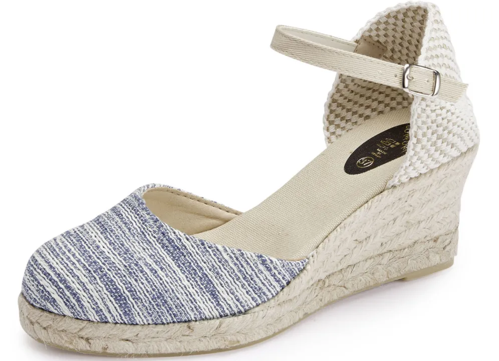 Modische Sandalette aus Textilmaterial: verstellbare Schließe mit verdecktem Gummizug, gepolsterte Decksohle, Gummilaufsohle sowie jutebezogener 50 mm Keilabsatz