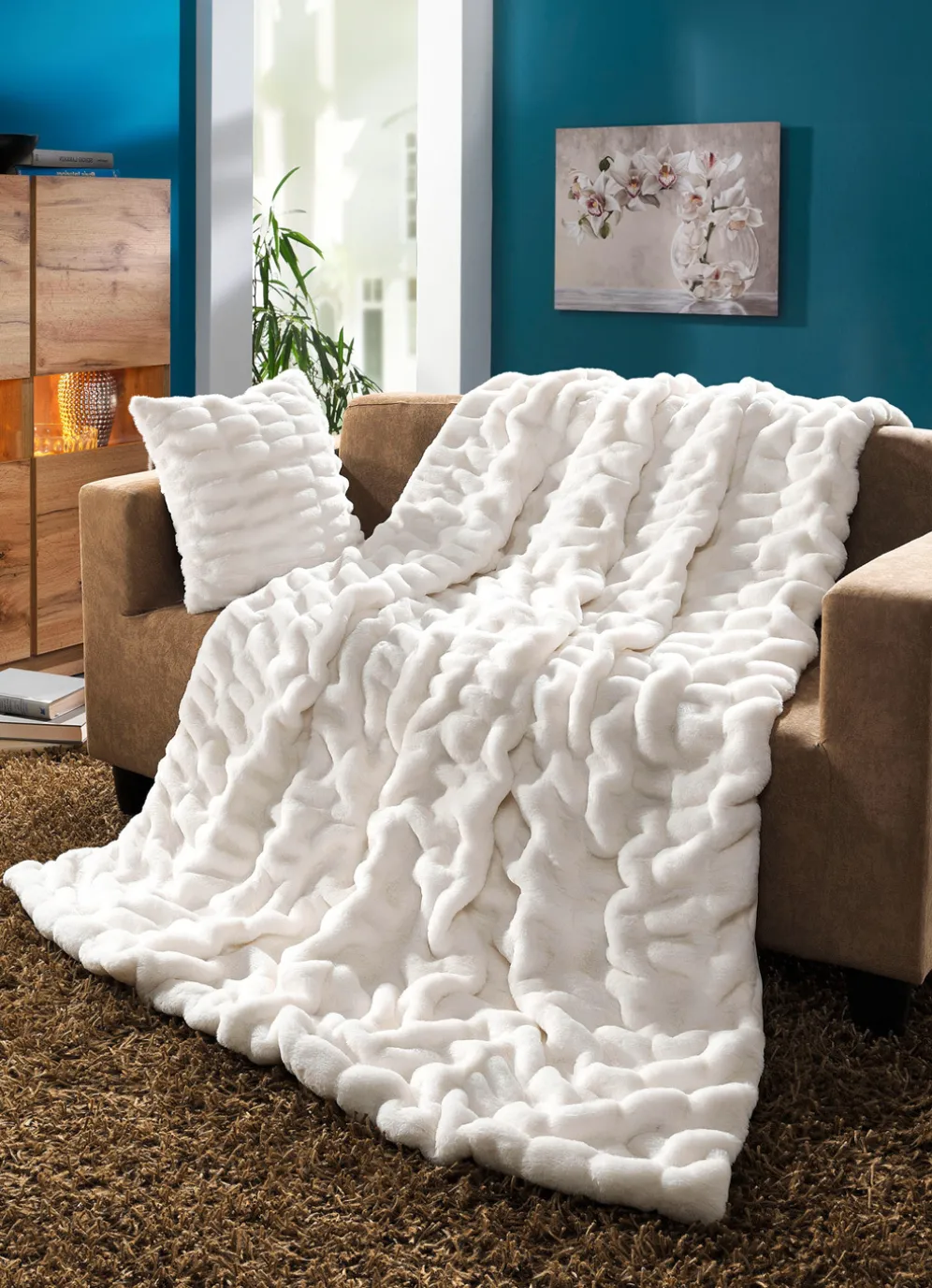 Sanfte, edle Webpelz-Felldecke Premium und Kissenbezug in Größe 905 (Kissenbezug, 40×40 cm) und in Weiss.