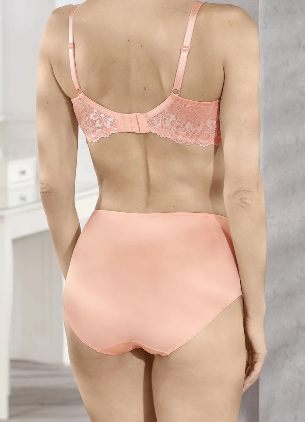 Pfirsichfarbener „Sassa“-Bügel-BH aus unterlegter, dezent glänzender Elastikspitze, mit seitlichen Stützstäbchen sowie verstellbaren Stretchträgern.