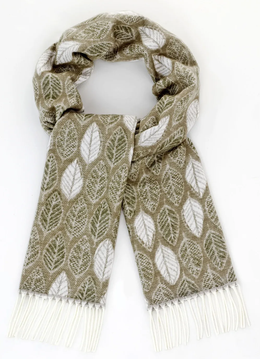 Schal mit Blätterdessin in Khaki-Oliv-Ecru.