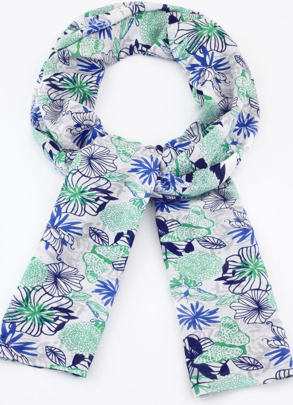 Dieser weiche Schal überzeugt mit Fantasieblüten-Dessin und originellen Schmetterlingsmotiven in Smaragdgrün-Marine-Kobaltblau auf naturfarbenem Grund. Maße: 180×50 cm