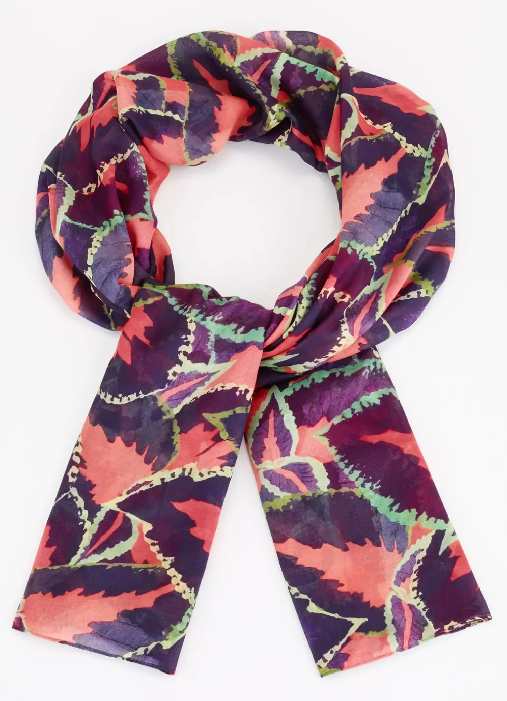 Ansprechender Schal mit Fantasiedessin in Signalrot-Grün auf pflaumefarbenem Grund.