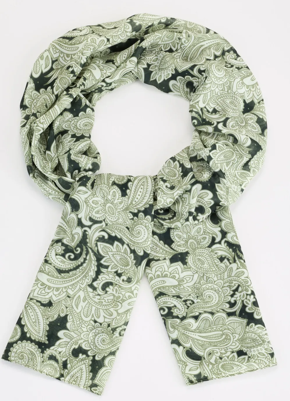 Fantastischer Schal mit Fantasiedessin in Oliv- Lindgrün-Khaki.Maße: 180×70 cm