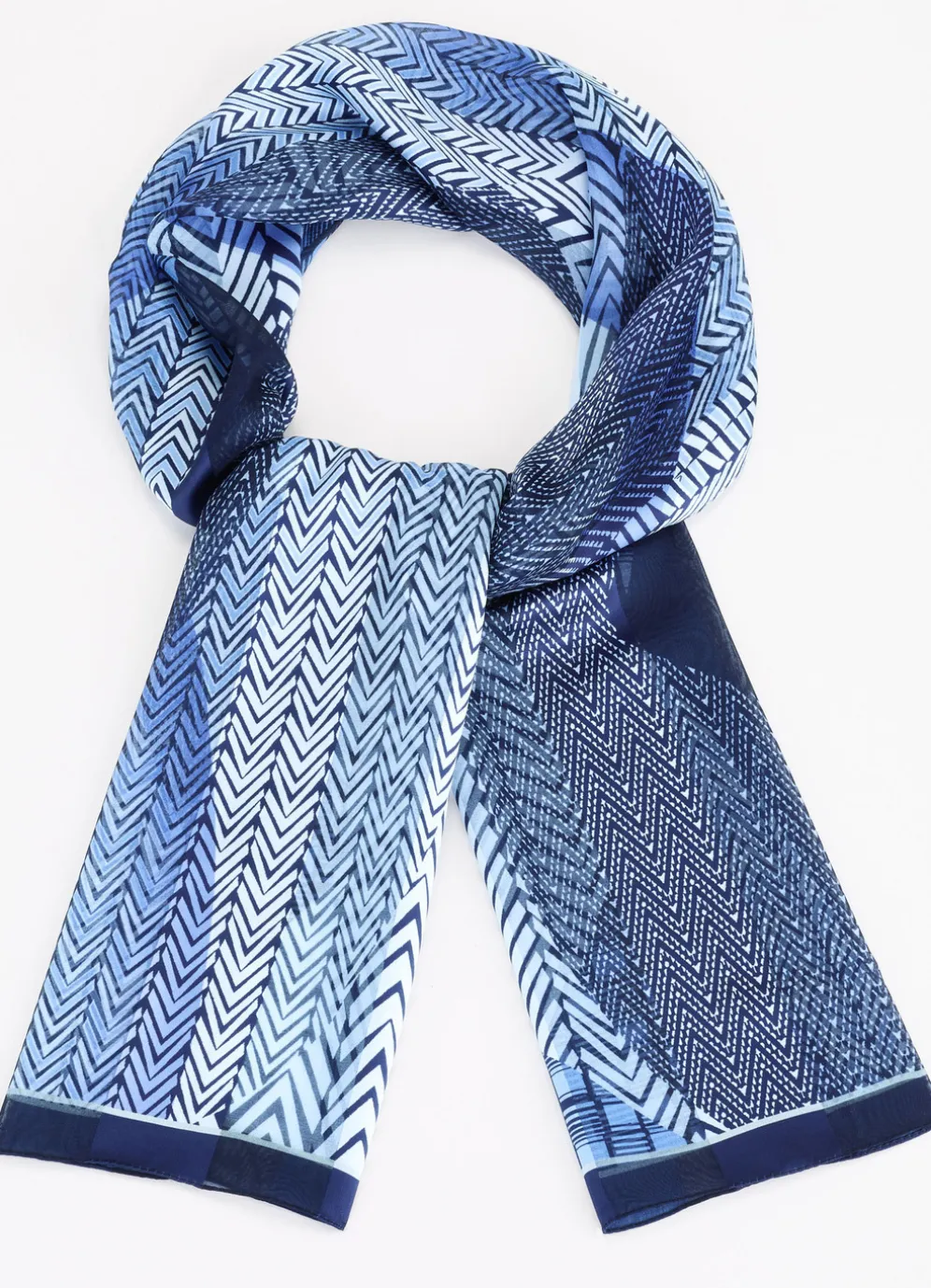 Schal mit Fantasiedessin in Bleu-Nachtblau-Grau-Schwarz.
