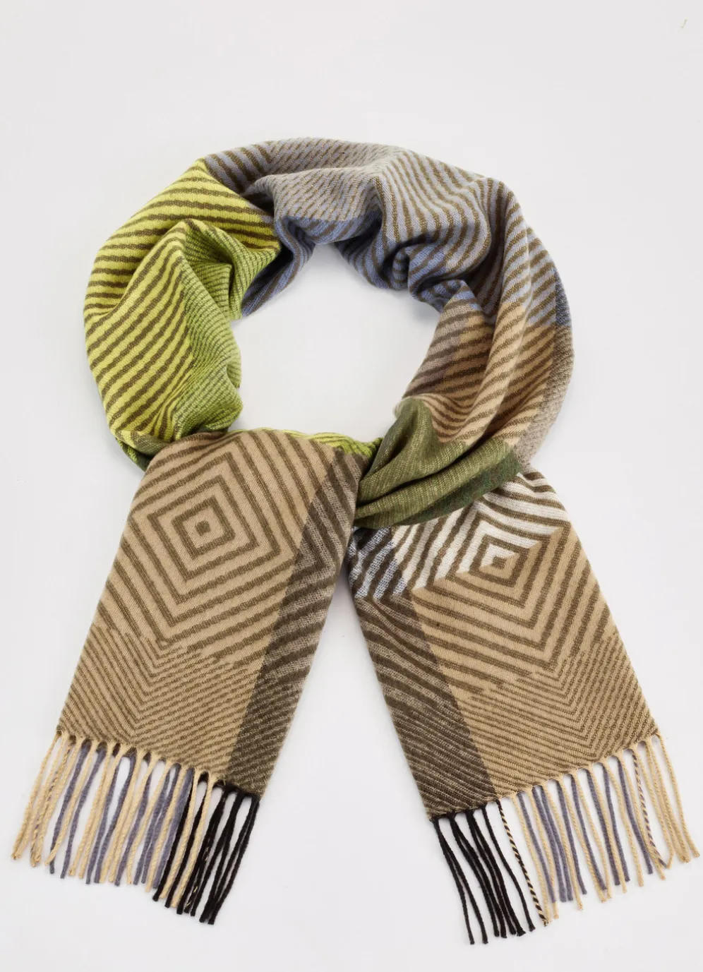 Schal mit Fantasiedessin in Braun-Pistazie-Oliv-Bleu.