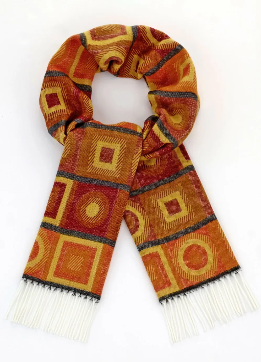 Der weiche und kuschelige Schal besticht durch das Dessin von geometrischen Formen in Safran-Orange-Ziegelrot-Schwarz sowie gedrehten Fransen an den Enden. Maße: 180×30 cm.