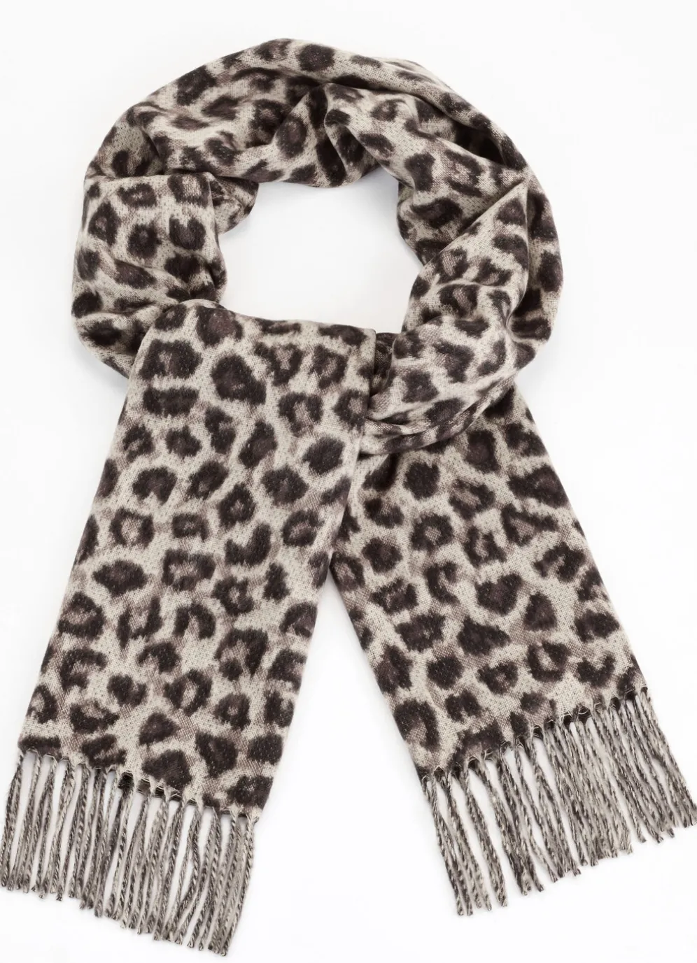 Dieser Schal begeistert mit seinem angesagten Raubtierfell-Dessin in Beige-Mokka-Schwarz sowie gedrehten Fransen an den Enden. Maße: 180×30 cm