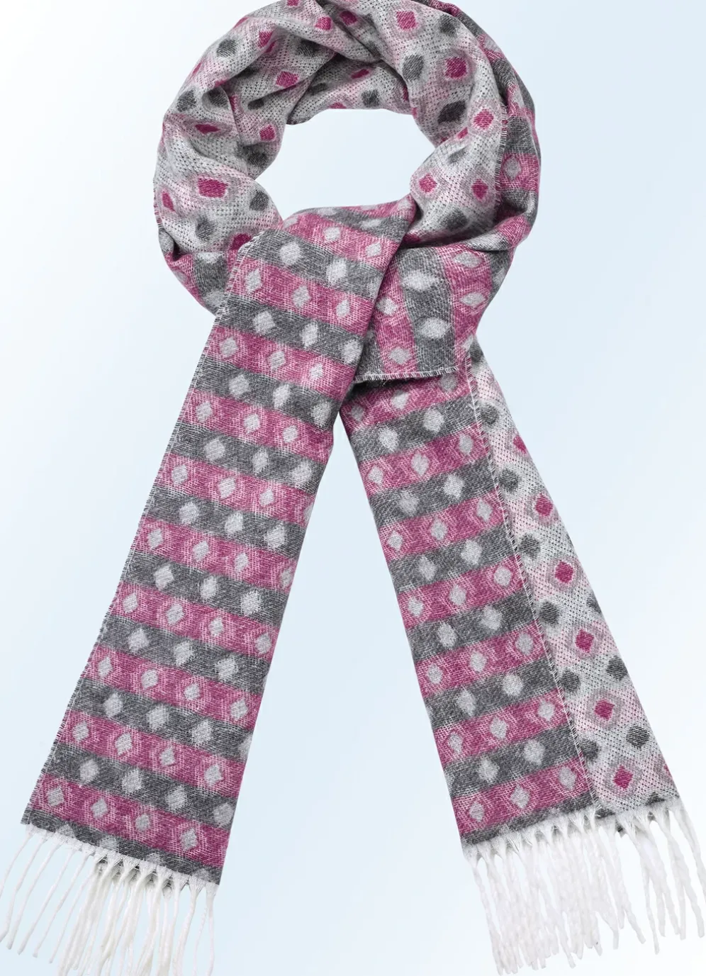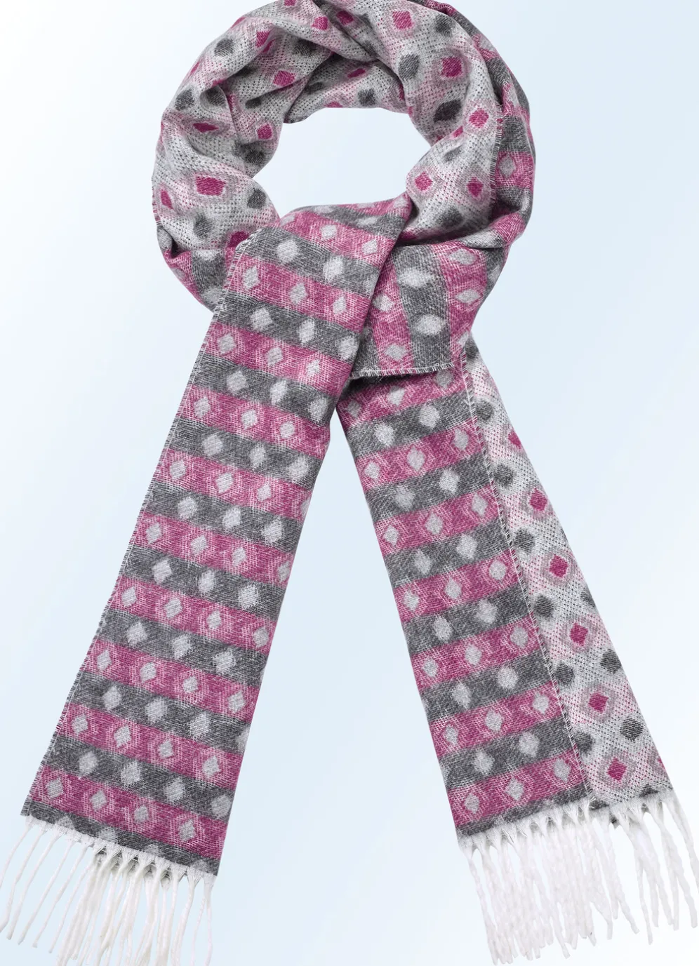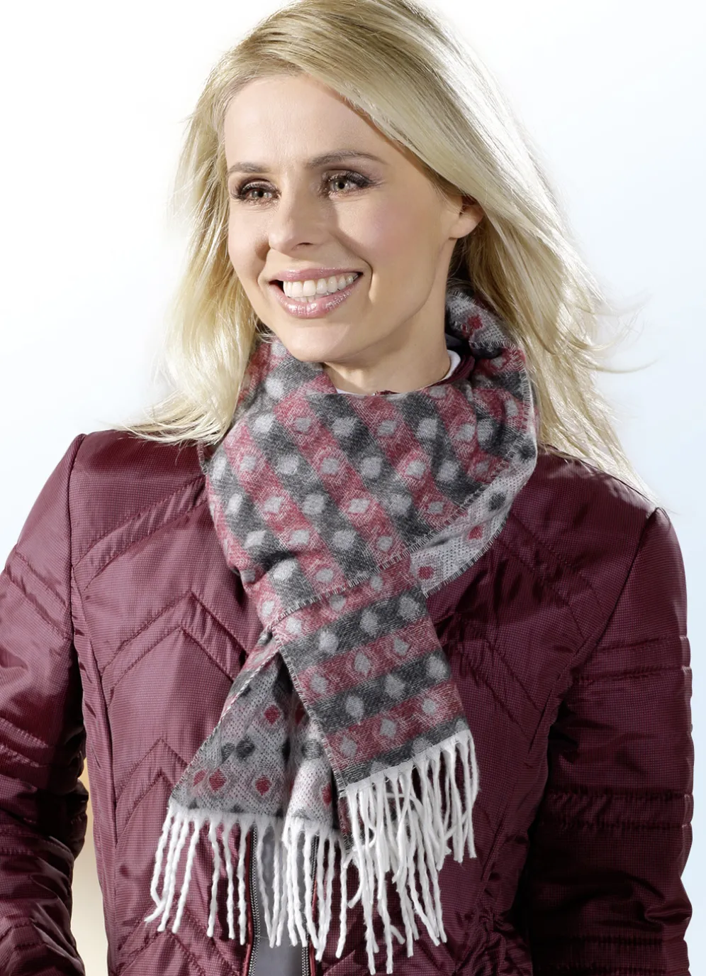 Pfiffiger Schal mit Rautendessin in Hellgrau-Beere-Anthrazit sowie gedrehten Fransen an den Enden. Maße: 180×30 cm