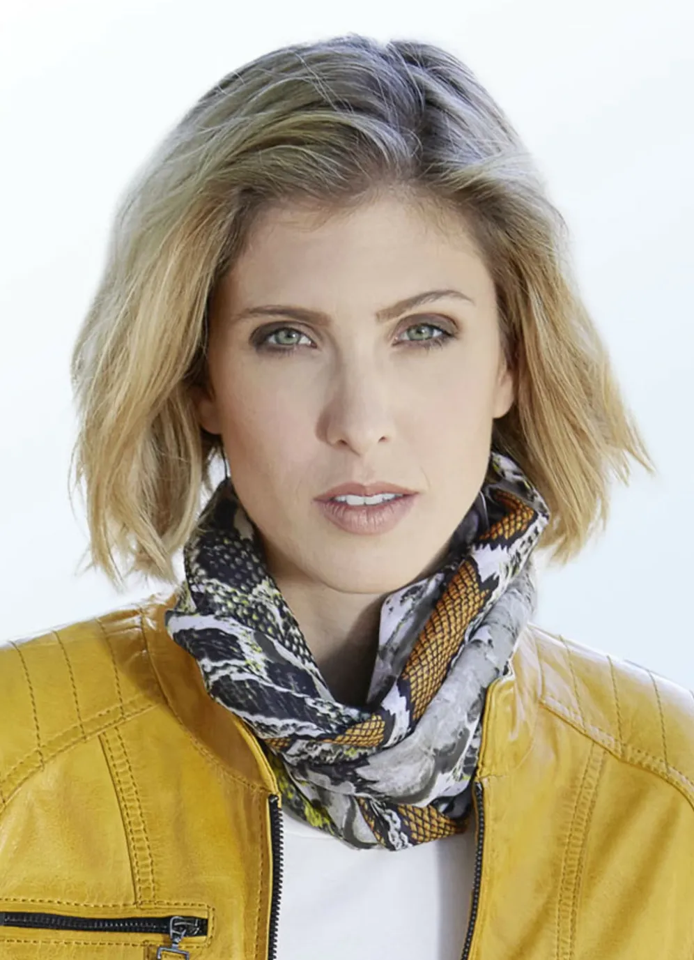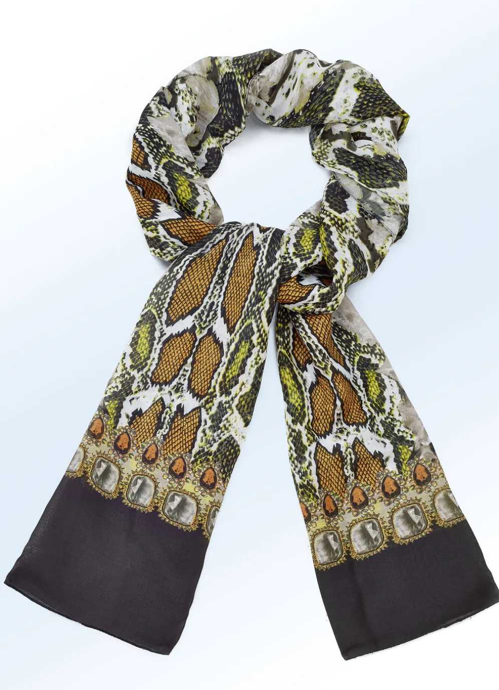Trendstarker Schal mit angesagtem Reptildessin in Ocker-Oliv-Zitrone auf weißem Fond sowie schwarzen Streifen an den Enden. Maße: 180×50 cm.
