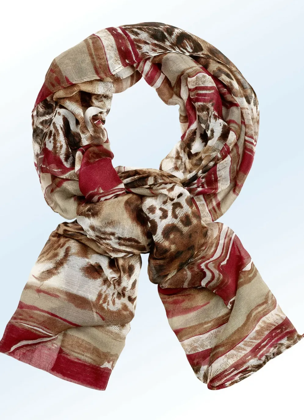 Ausdrucksstarker Schal in Sand-Mokka-Karminrot, mit Streifen und Raubtierfell-Dessin. Maße: 180×70 cm