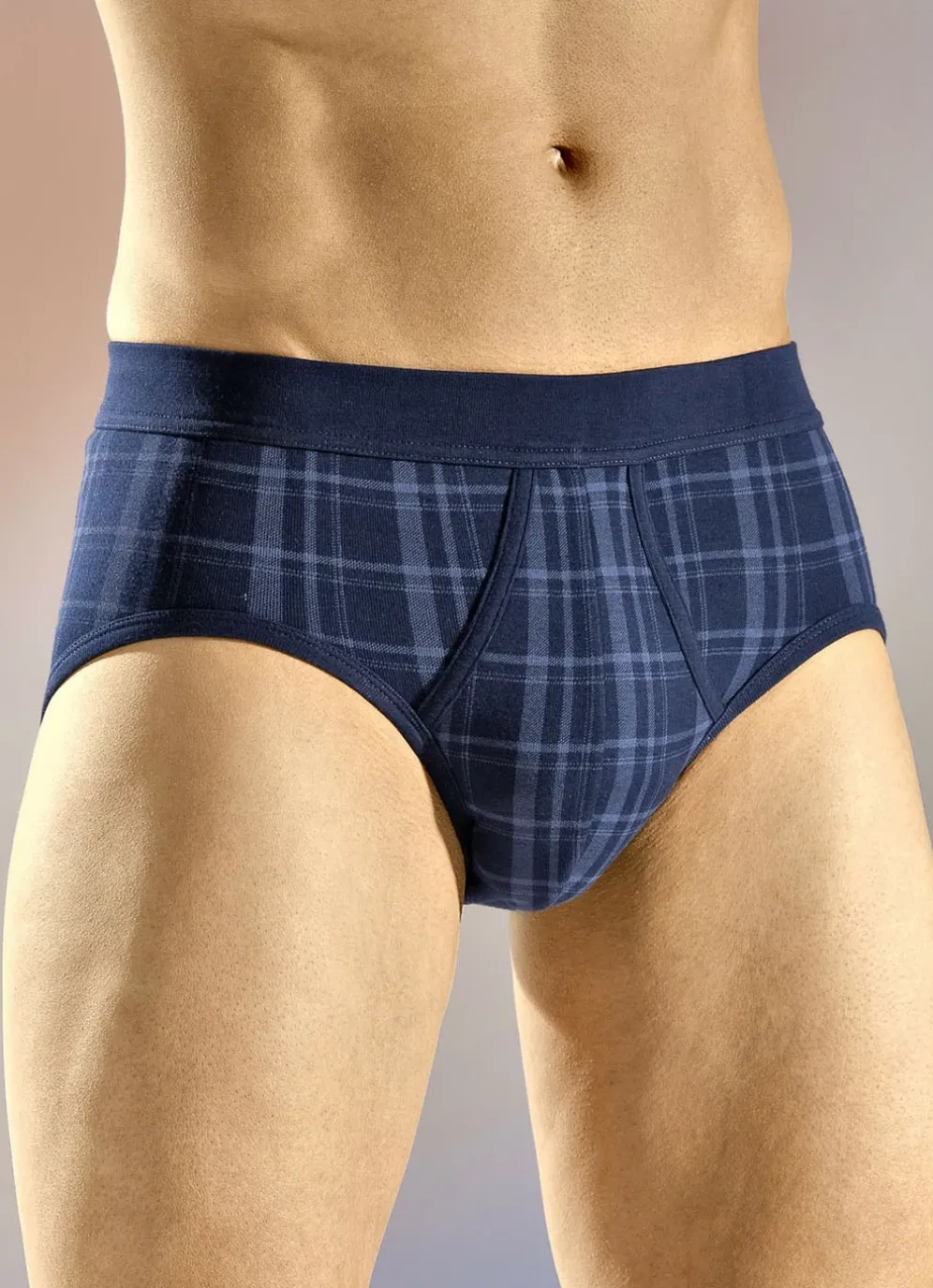 „Schiesser“-Slip in Marine, mit Karodessin, Label am Softbund sowie paspeliertem Eingriff.