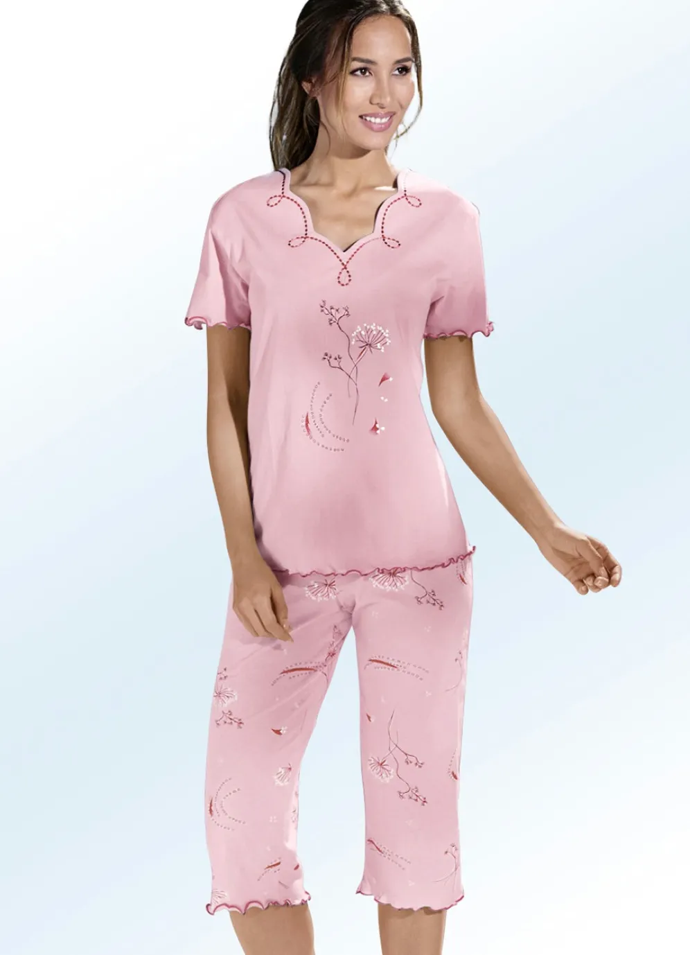 Hinreißender Schlafanzug mit konstrastfarben gebogten Abschlüssen: Oberteil mit Kontraststickerei am Halsausschnitt, platziertem Druck im Vorderteil sowie kurzen Ärmeln. Dazu passt die wadenlange Hose mit Dehnbund sowie offenen Beinabschlüssen.