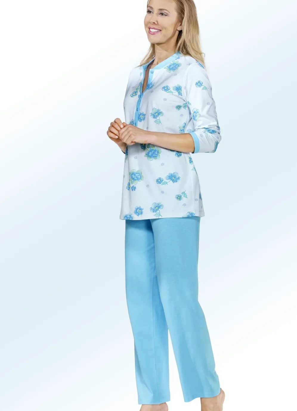 Schlafanzug, Langarm mit Knopfleiste in Zartbleu-Türkis-Bunt und in Größe 36.