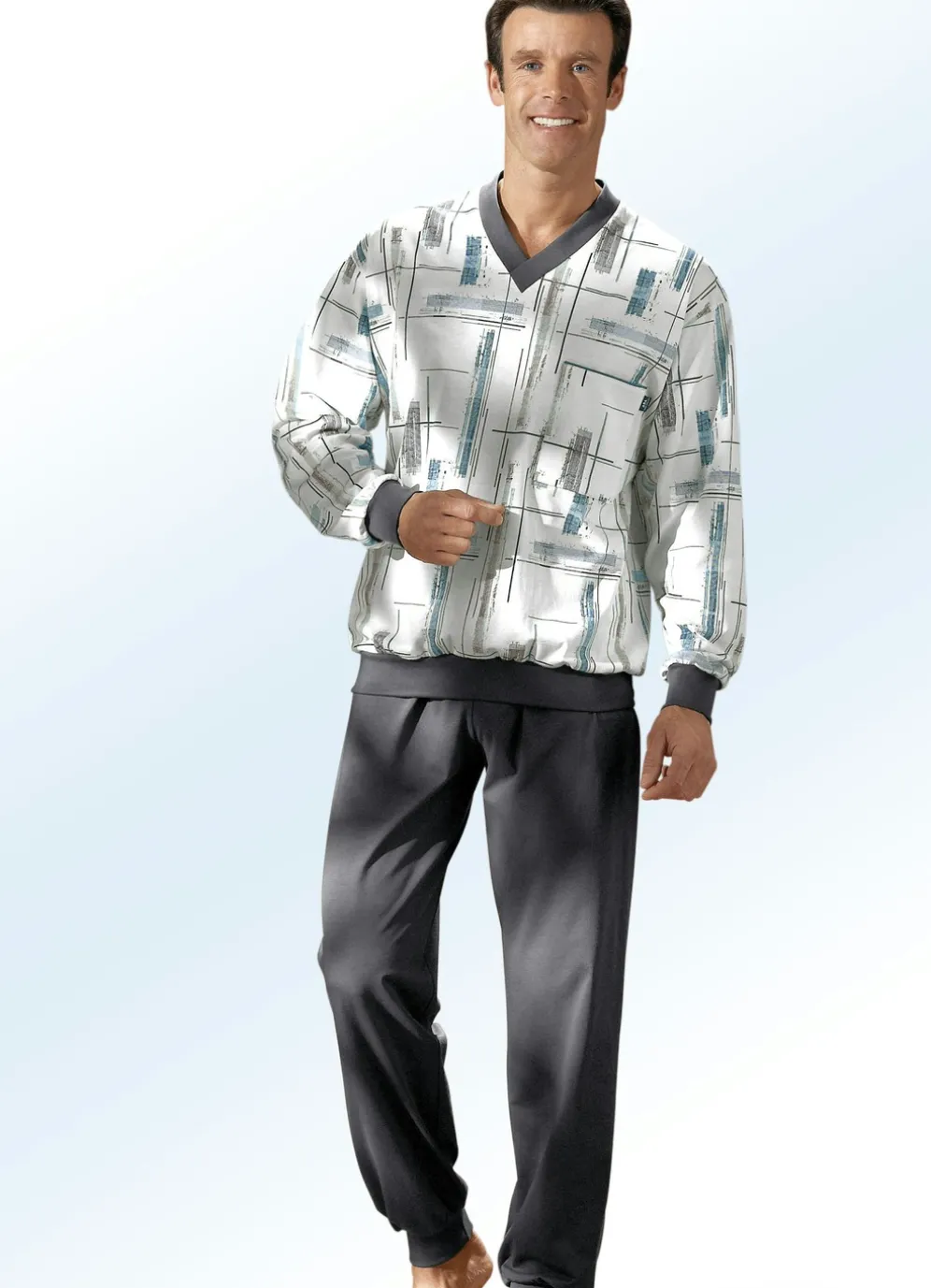 Toller Schlafanzug mit komfortablen Bündchenabschlüssen: Das allover dessinierte Oberteil ist mit V-Ausschnitt sowie aufgesetzter Brusttasche gearbeitet. Die lange Hose ist mit auswechselbarem Gummizug im Bund ausgestattet.