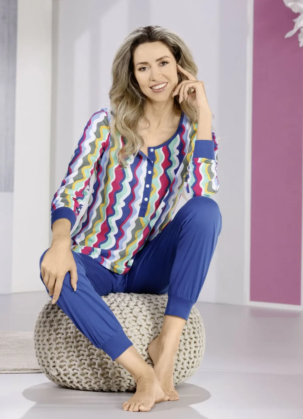 am Ausschnitt, lange Knopfleiste und Ärmel. Lange Hose mit Dehnbund.