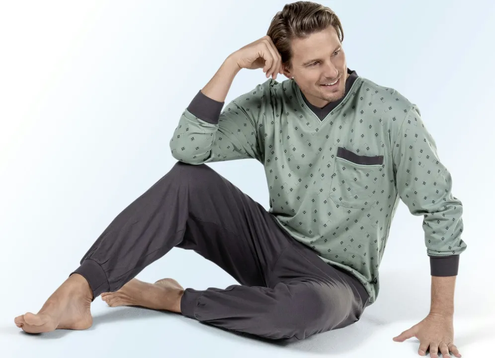 Hervorragender Schlafanzug mit bequemen Bündchenabschlüssen: Oberteil in Schilfgrün-Grafit, mit V-Ausschnitt, aufgesetzter Brusttasche, Kontrastpaspeln sowie innerem Rückensattel. Lange, grafitfarbene Hose mit auswechselbarem Gummizug im Bund.