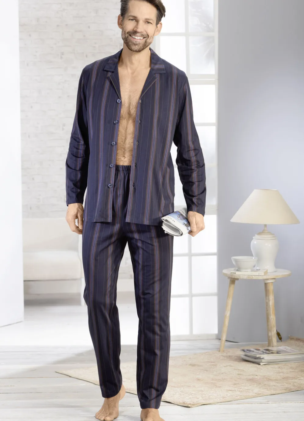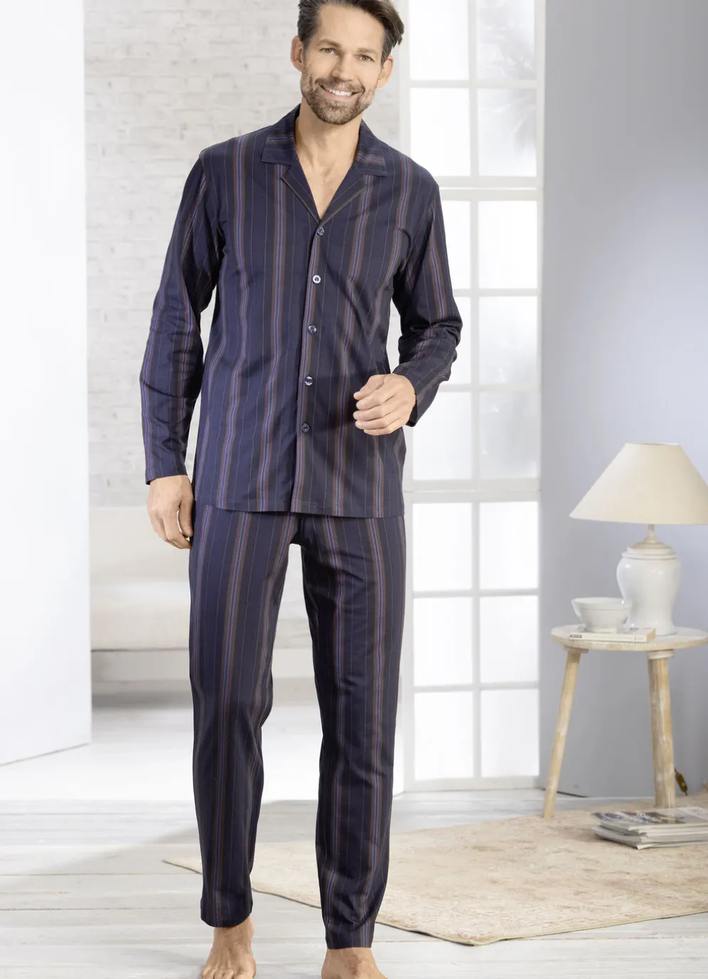 Geschmackvoller Schlafanzug in Aubergine-Bunt: Streifendessin, durchgeknöpftes Oberteil mit Reverskragen und innerem Rückensattel. Lange Hose mit Dehnbund sowie offenen Beinabschlüssen.