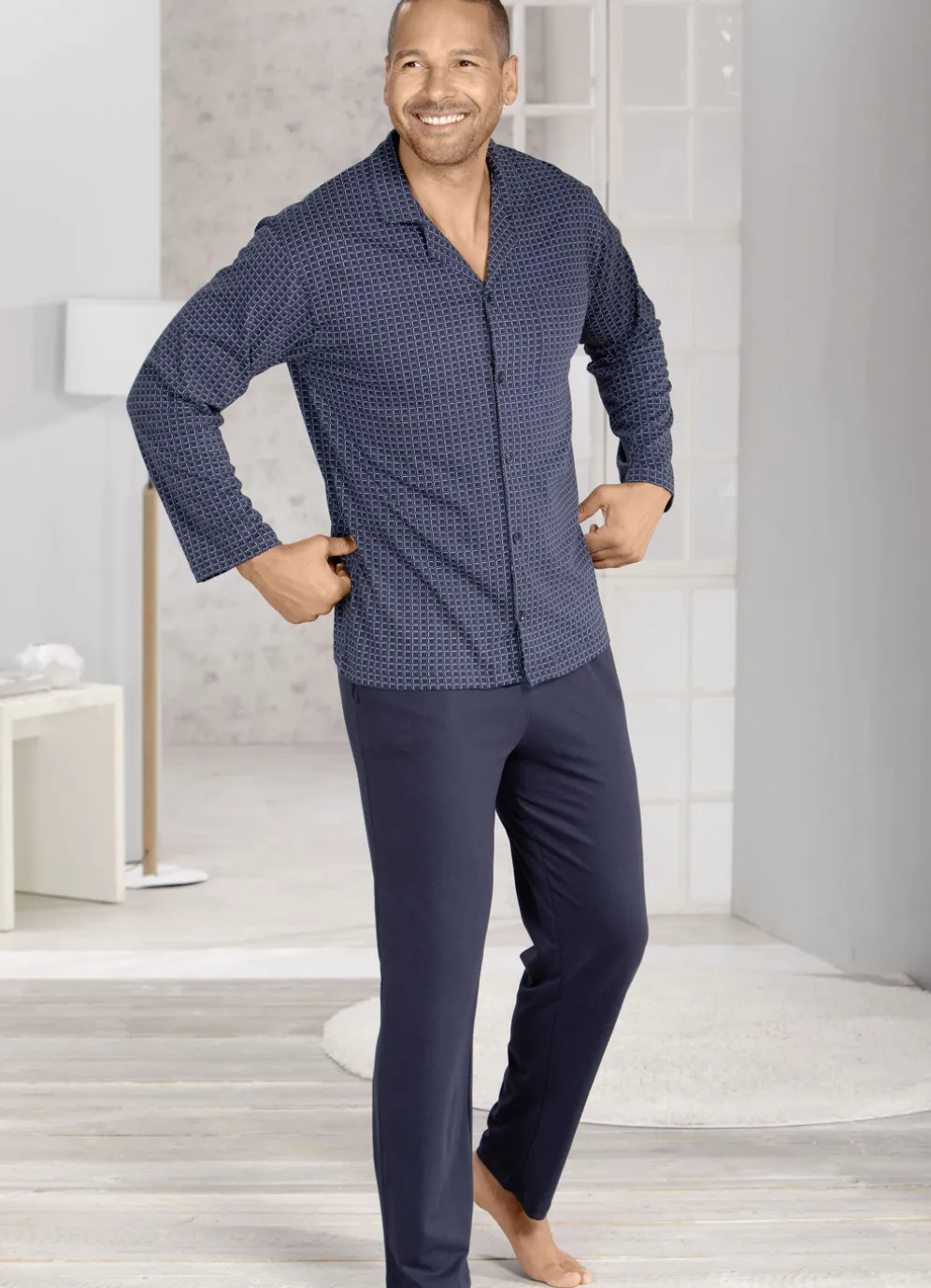 Geschmackvoller Schlafanzug in Marine! Allover dessiniertes, durchgeknöpftes Oberteil mit Reverskragen, aufgesetzter Brusttasche sowie innerem Rückensattel. Lange Hose mit Dehnbund, Seitentaschen und offenen Beinabschlüssen.