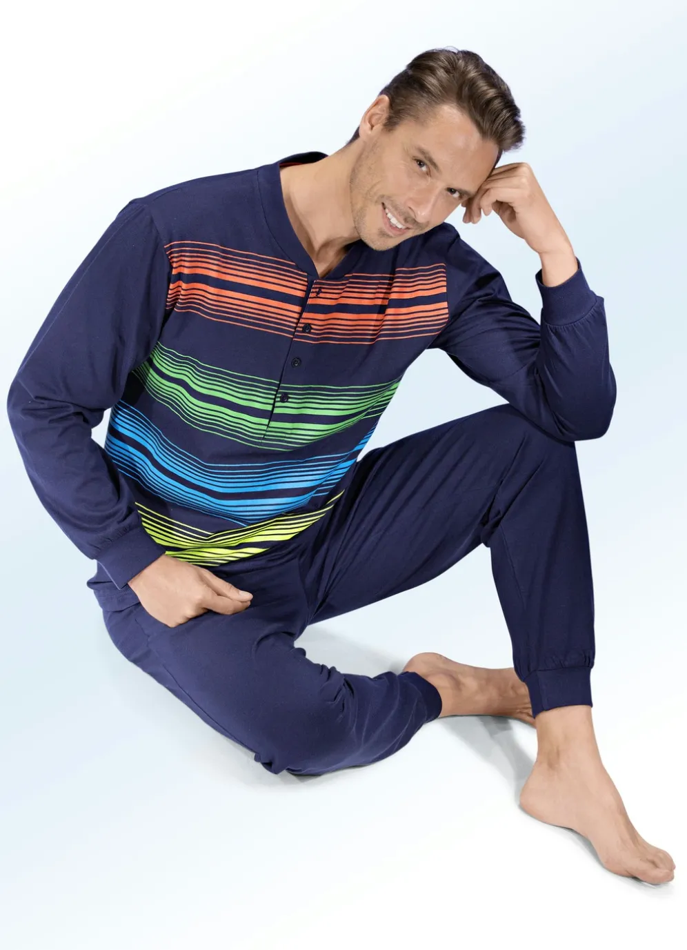 Oberteil mit Knopfleiste, farbigem Streifendessin vorne sowie Ärmelbündchen. Lange Hose in Marine, mit auswechselbarem Gummizug im Bund sowie Bündchenabschlüssen.
