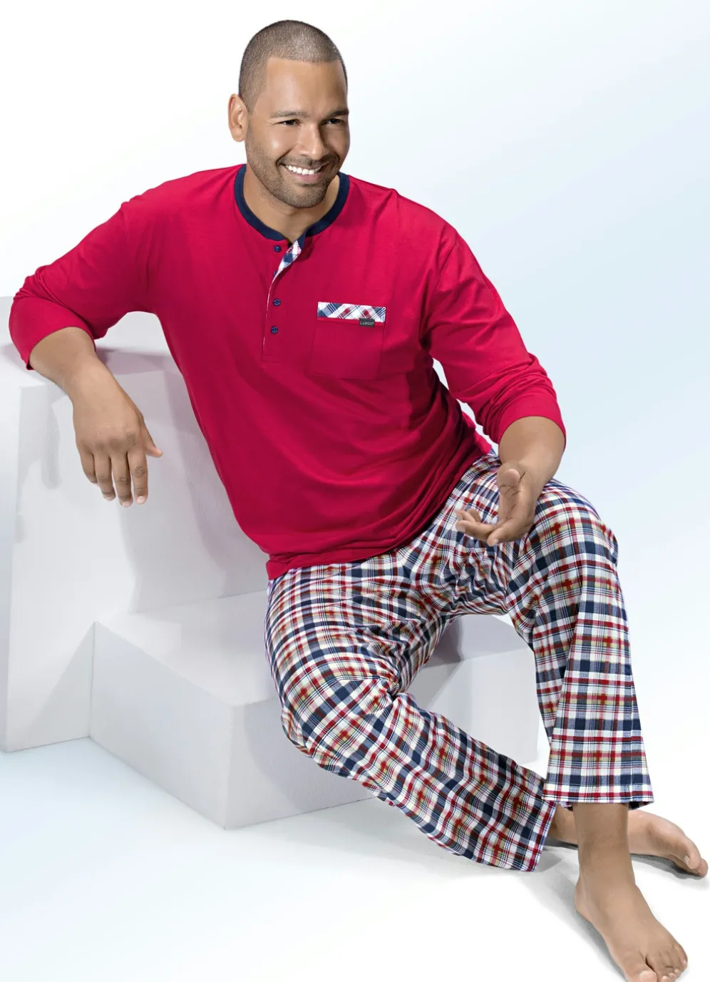 Schlafanzug mit Knopfleiste, Brusttasche und Karodessin in Rot-Bunt und in Größe 60.