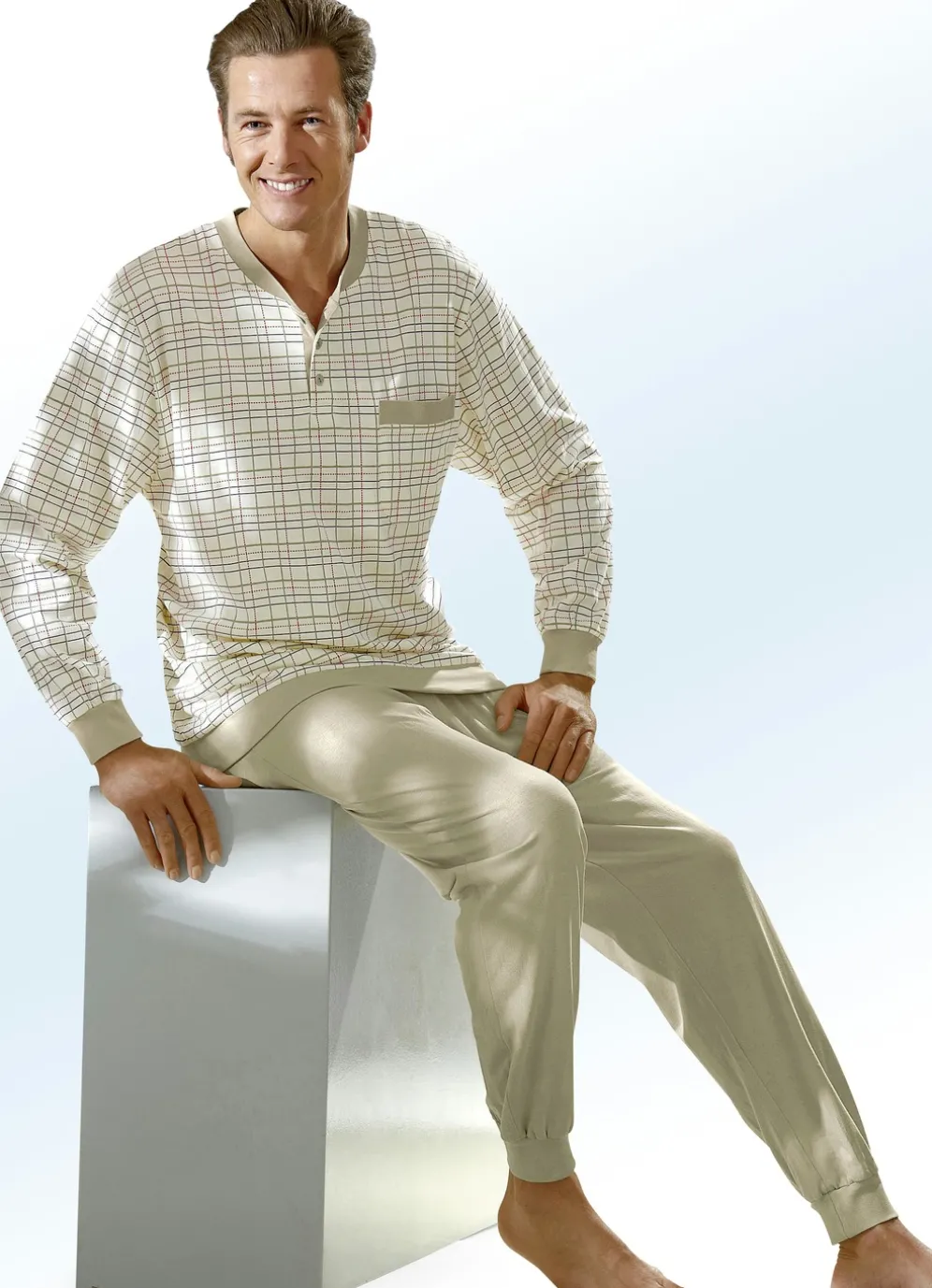 Hübscher, ecru-sandfarbener Schlafanzug: Das Oberteil mit uni Bündchen an den langen Ärmeln und am Saum zeigt ein Karodessin in Reseda-Weinrot-Anthrazit allover, kontrastunterlegte Knopfleiste, Blende an der aufgesetzten Brusttasche sowie inneren Rückensattel. Lange, uni Schlafanzughose mit auswechselbarem Gummizug im Bund sowie Bündchenabschlüssen.