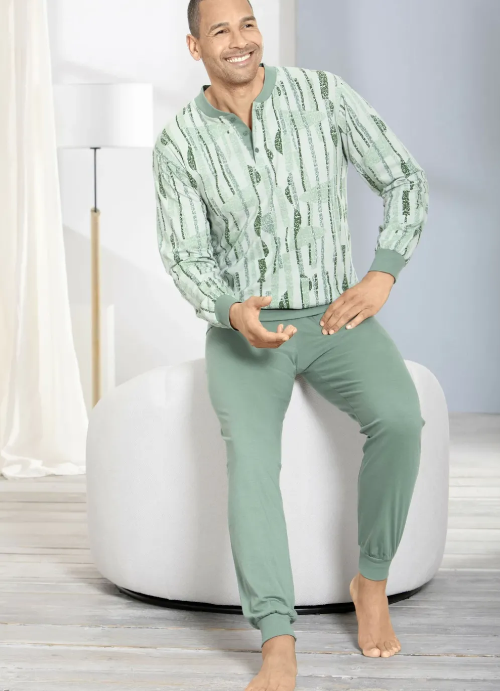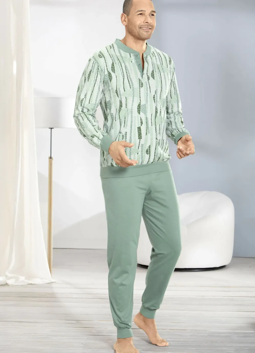 Lässiger Schlafanzug mit Bündchenabschlüssen: allover dessiniertes Oberteil in Jadegrün-Mint mit