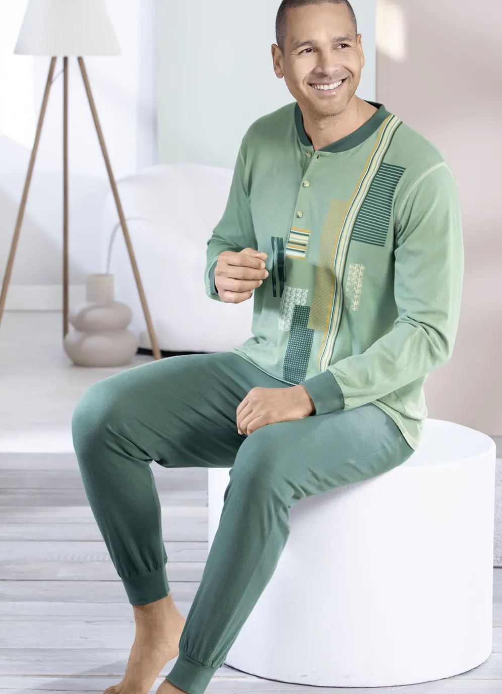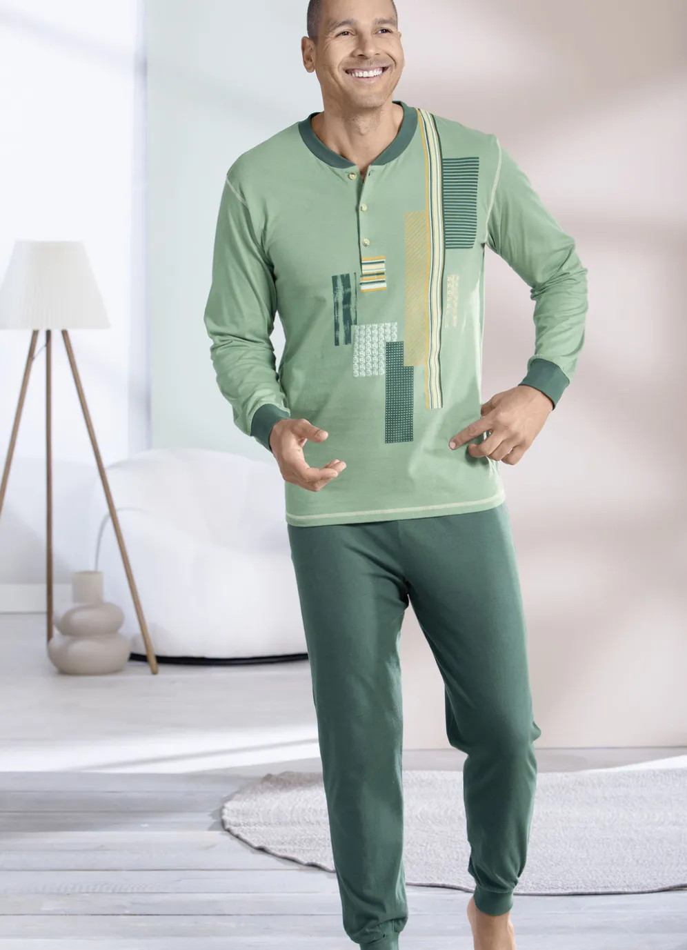 Geschmackvoller Schlafanzug in Jadegrün-Wacholder-Bunt mit Bündchenabschlüssen. Oberteil mit Knopfleiste sowie platziertem Druck vorne. Lange Hose mit auswechselbarem Gummizug im Bund.