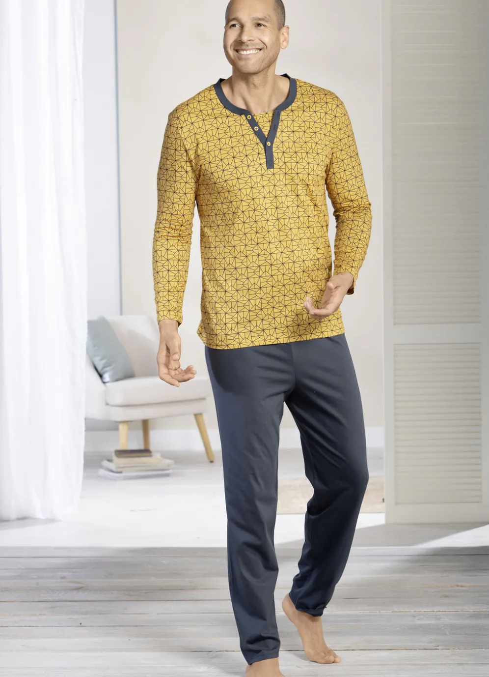 Außergewöhnlich gestalteter Schlafanzug in Honig-Anthrazit mit offenen Abschlüssen: Allover dessiniertes Oberteil mit unterlegter Knopfleiste sowie innerem Rückensattel. Lange Hose mit Dehnbund.